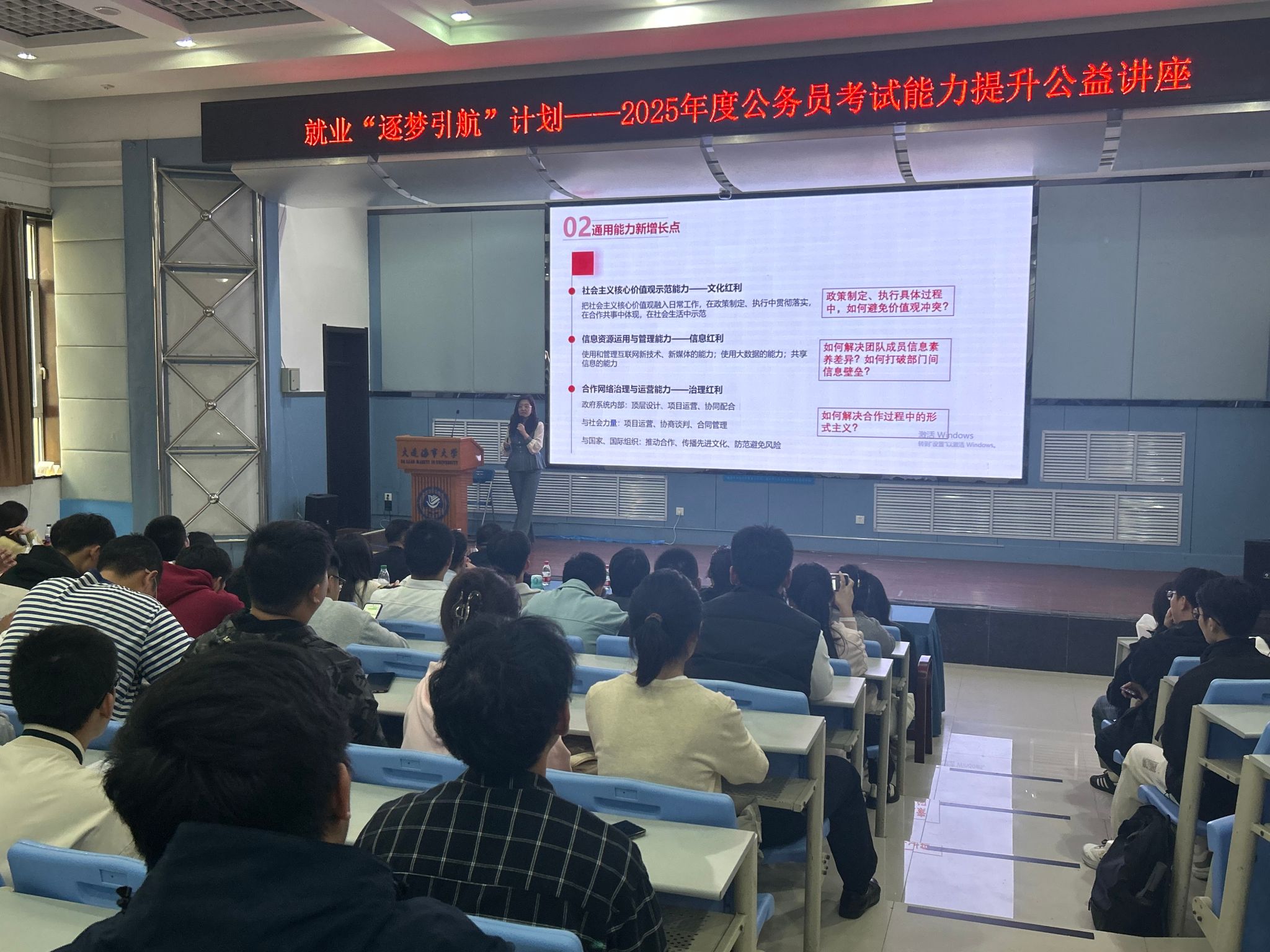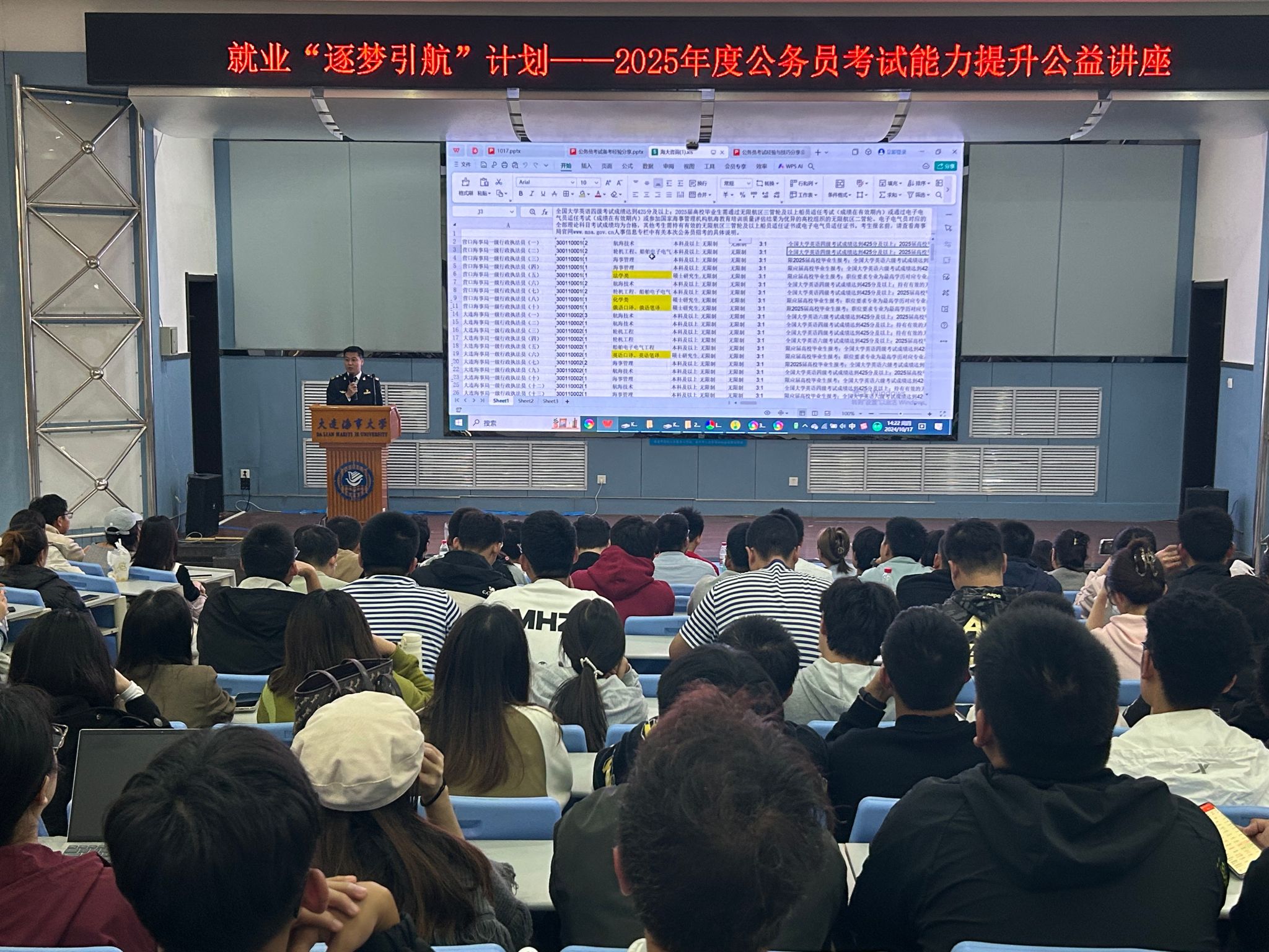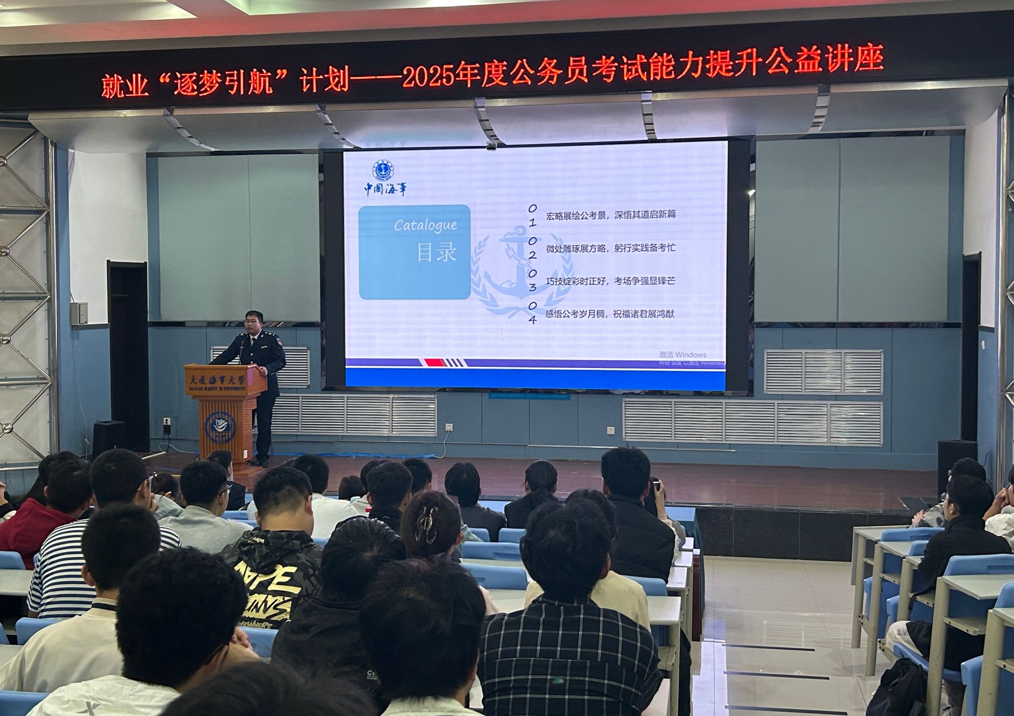 为深入贯彻《中共中央 国务院关于实施就业优先战略促进高质量充分就业的意见》,引导帮助学生积极投身海事系统,帮助学生更好地备考政策性岗位考试,学生就业指导中心围绕“12345”特色学生就业工作格局,深入实施就业“五航计划”,10月17日下午在启航楼101联合辽宁海事局举办2025年度公务员考试能力提升公益讲座,百余名学生参加此次活动。