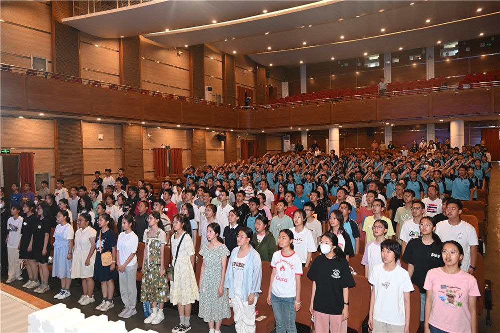 伴随着《最美的太阳》的悠扬旋律和同学们的掌声、欢呼声,九年级任课教师步入会场。《骄傲的少年》的激昂旋律响起,大屏幕播放回忆视频,九年成长的足迹缓缓铺陈开来。岁月如流,冲刷了记忆的碎片,留下了明媚的瞬间。在海附的九载寒暑,初春赏高雅莹洁的玉兰,盛夏观热烈绽放的蔷薇,仲秋品饱满可口的柿子,冬日踏松软绵密的积雪。沐浴在海附幸福教育的阳光下,昔日青涩稚嫩的孩童全面发展、茁壮成长,蜕变成如今的翩翩少年。居家学习汲取知识的热切目光,田径赛道奋勇向前的矫健身姿,科技活动勤奋动手的忙碌身影,生本课堂小组合作的积极踊跃,研学实践参观探索的严谨认真……所有的一切,让不同的个体拥有了共同的牵挂和印记。一张张青春的面庞浮现,一幕幕温馨的互动闪过,叹光阴荏苒,更感海附恩情。随后,播放中考前夕在校的精彩片段和老师家长们送考的温馨场面。温馨的回忆过后,典礼正式开始。在庄严的国歌声中,全体师生肃穆站立。