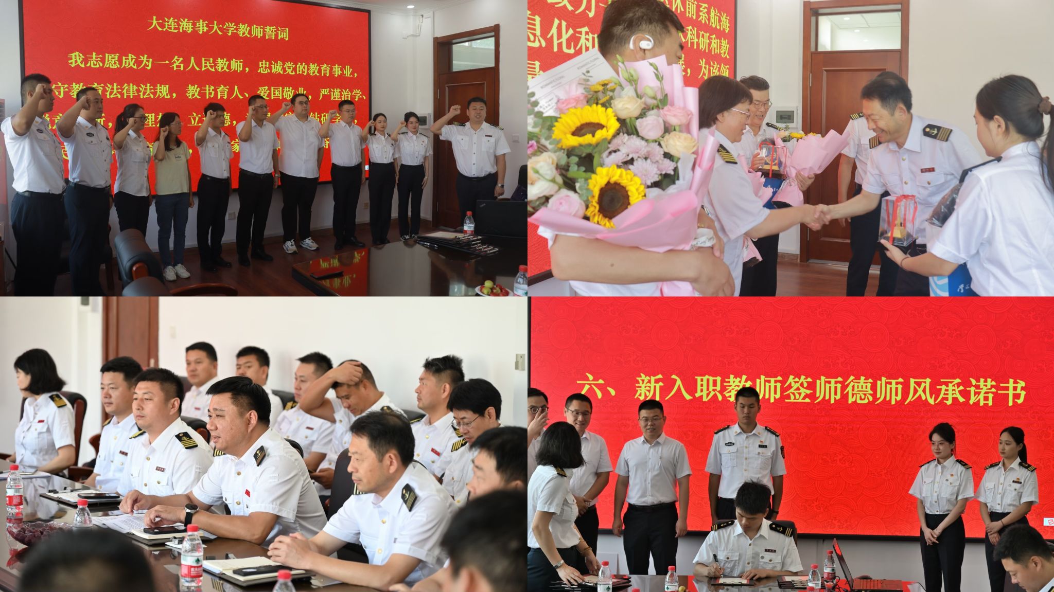 学院为10位新教师举行了入职仪式,由荣退老教师为新教师佩戴校徽,签署师德师风承诺书,举行入职宣誓。新教师代表纷纷发言,对个人的学习发展经历进行了介绍,表示十分荣幸加入航海学院大家庭,对新角色充满期待,对在这一全新平台上开展工作充满干劲。
