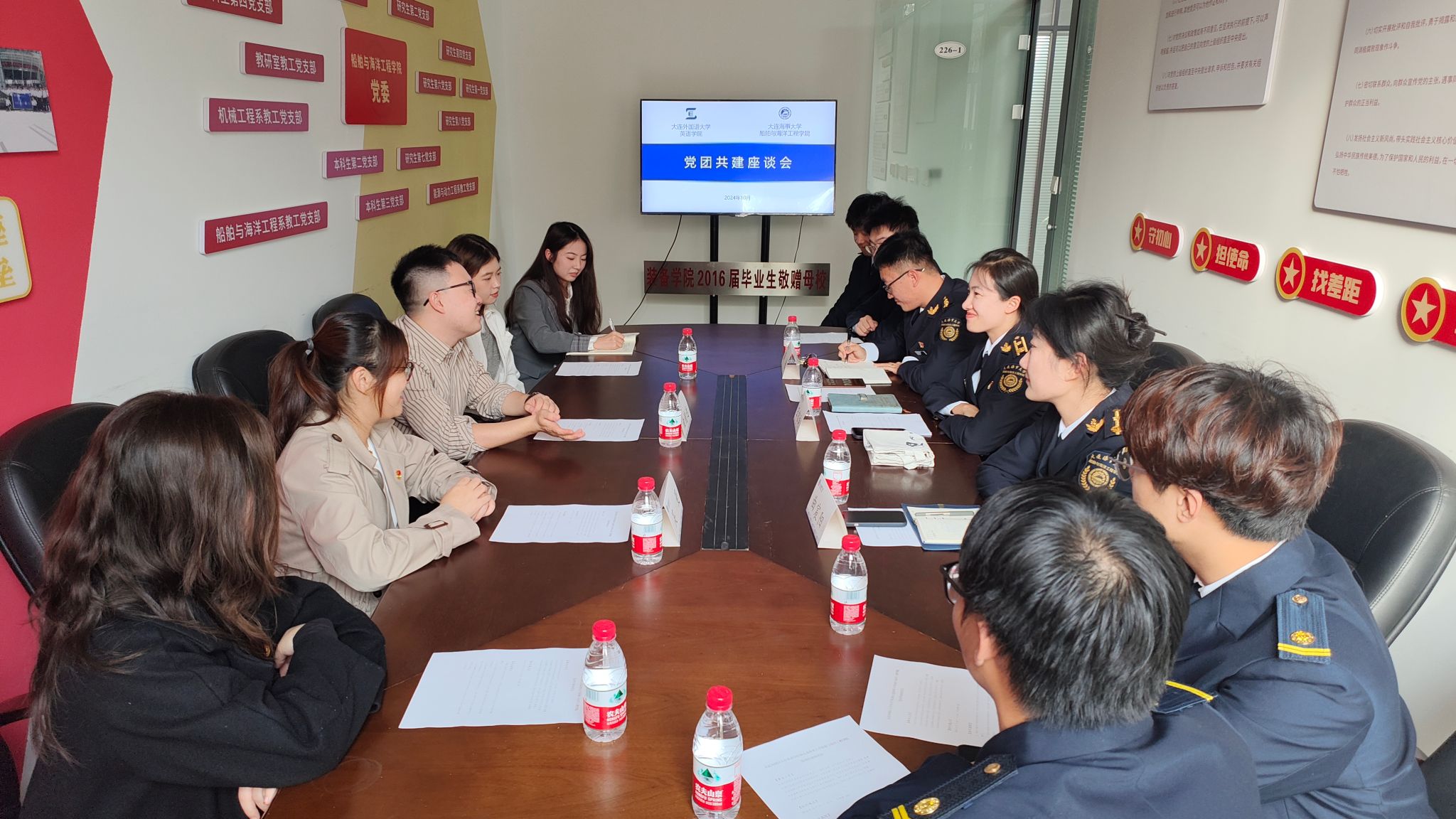 船舶与海洋工程学院团委书记王宏诗对大连外国语大学英语学院一行表示热烈欢迎,随后结合学院研究生、本科生党支部建设以及党团工作常态化开展等情况作简要介绍。大连外国语大学英语学院团委书记曲镜达围绕支部建设、入党积极分子遴选与培养以及主题党日活动等方面作交流分享。座谈会上,双方就未来共建事宜做进一步商讨,并对后续工作推进达成共识。