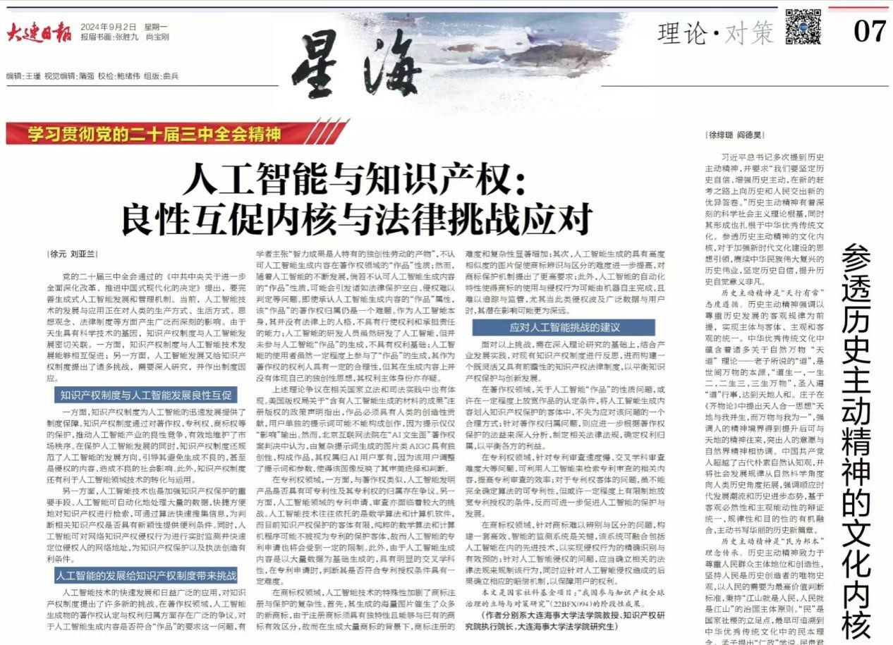9月2日,大连海事大学法学院教授、知识产权研究院执行院长徐元及大连海事大学法学院研究生刘亚兰在《大连日报》发表题为《人工智能与知识产权:良性互促内核与法律挑战应对》的观点。