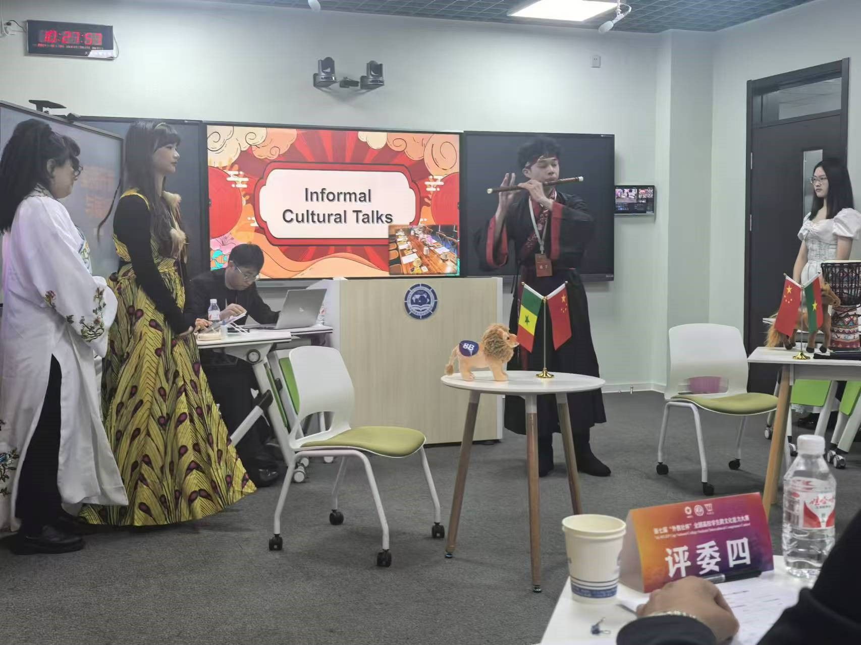 10月19日,参赛团队在外国语学院智慧教室进行复赛,经过激烈角逐,14支参赛队伍成功晋级决赛。在10月20日的决赛中,选手们通过知识问答、情境述评、讲述中国故事等环节,展示了他们对跨文化问题的分析和应对能力,充分体现了当代大学生对世界文化多样性的理解和尊重,以及对中国文化的热爱与自信。