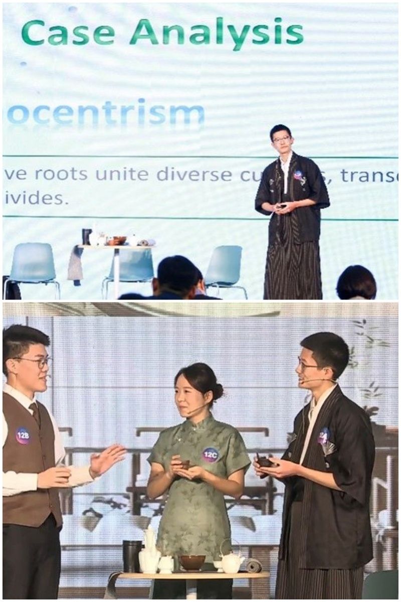 全国决赛包括跨文化交际案例开发与展析、评委提问、名言名句解读3个环节;全国总决赛包括知识问答、情境评述、讲述中国故事3个环节。我校选手在“案例开发与展示”环节中,选择了多元文化生活领域的案例,以宋代点茶文化为立足点,生动演绎了一场跨文化对话。在现场,选手们不仅生动展示了点茶的传统技艺,还将茶文化与现代生活的多元文化背景相结合,幽默而深刻地展现了文化冲突,并以开放和包容的态度提出了共存的解决方案,巧妙地诠释了中华优秀传统文化的包容性和创新性,赢得了评委的高度评价。