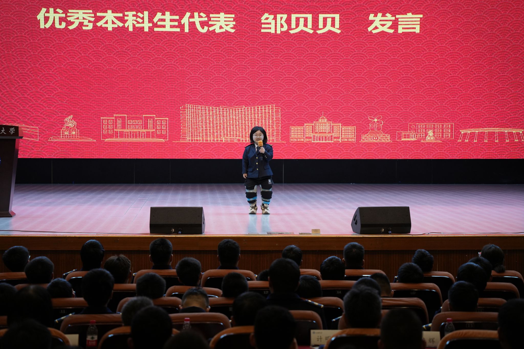 2024年辽宁省大学生年度人物、2024年学校“十佳大学生”荣誉获得者2021级本科生邹贝贝作为优秀本科生代表发言。她由衷地向学校和学院表达了培养她成长成才的感激之情,并围绕明确学习意义、保持奋斗心态和勇于突破自我三个方面进行了心得分享,鼓励同学们把握青春时光,珍惜在校学习机会,实现人生理想。