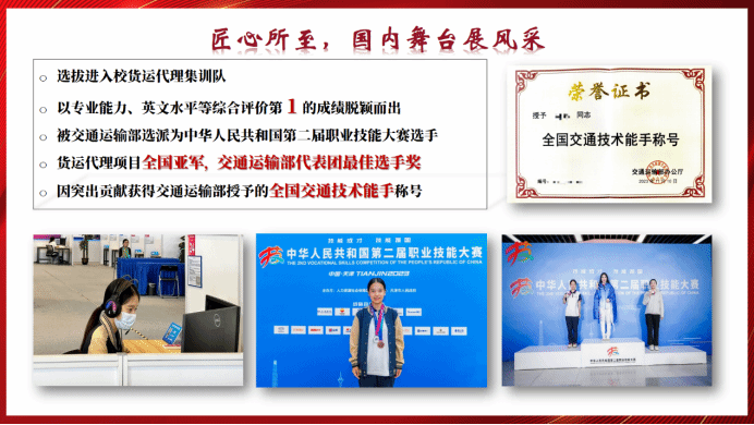 大二时,她参加中华人民共和国第二届职业技能大赛校内选拔,以综合评价第一的成绩代表交通运输部参加大赛,获全国银牌、代表团最佳选手奖。赛后获交通运输部颁发的全国交通技术能手称号,并将获全国技术能手称号,系我国技能领域最高荣誉,这更加坚定了她技能成才、技能报国的决心。2024年伊始,她入选世界技能大赛国家队,是年纪最小的队员。2024年3月,她以集中考核第二名的成绩,成为第47届世界技能大赛中国代表队备选选手。