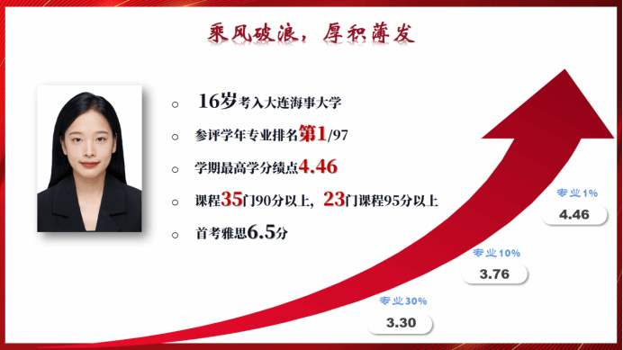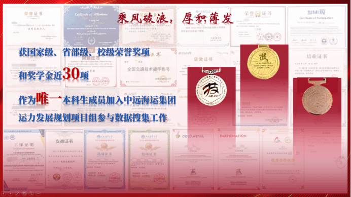 16岁初入大学的她,在大一时学习成绩并不出彩,但她并不气馁,奋起直追,大三学年专业排名第一,学期最高学分绩点4.46,所修课程35门达到90分以上。她首考雅思6.5分,同时辅修并获得国际经济与贸易双学位。在科研竞赛方面,她三年间获各类国家级、省部级、荣誉和奖学金近30项,作为唯一本科生成员加入中远海运集团运力发展规划项目组参与数据搜集工作。