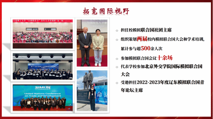 拓宽国际视野,她是青年外交事业热忱的实践者。她担任校模拟联合国社团主席,组织策划两届校内模拟联合国大会和学术培训,累计参与超500余人次。她参加模拟联合国会议十余场,曾代表学校参加北京外交学院国际模拟联合国大会,与来自全国高校优秀同学共同讨论全球议题,并受邀担任2022-2023年度辽东模拟联合国青年论坛主席。