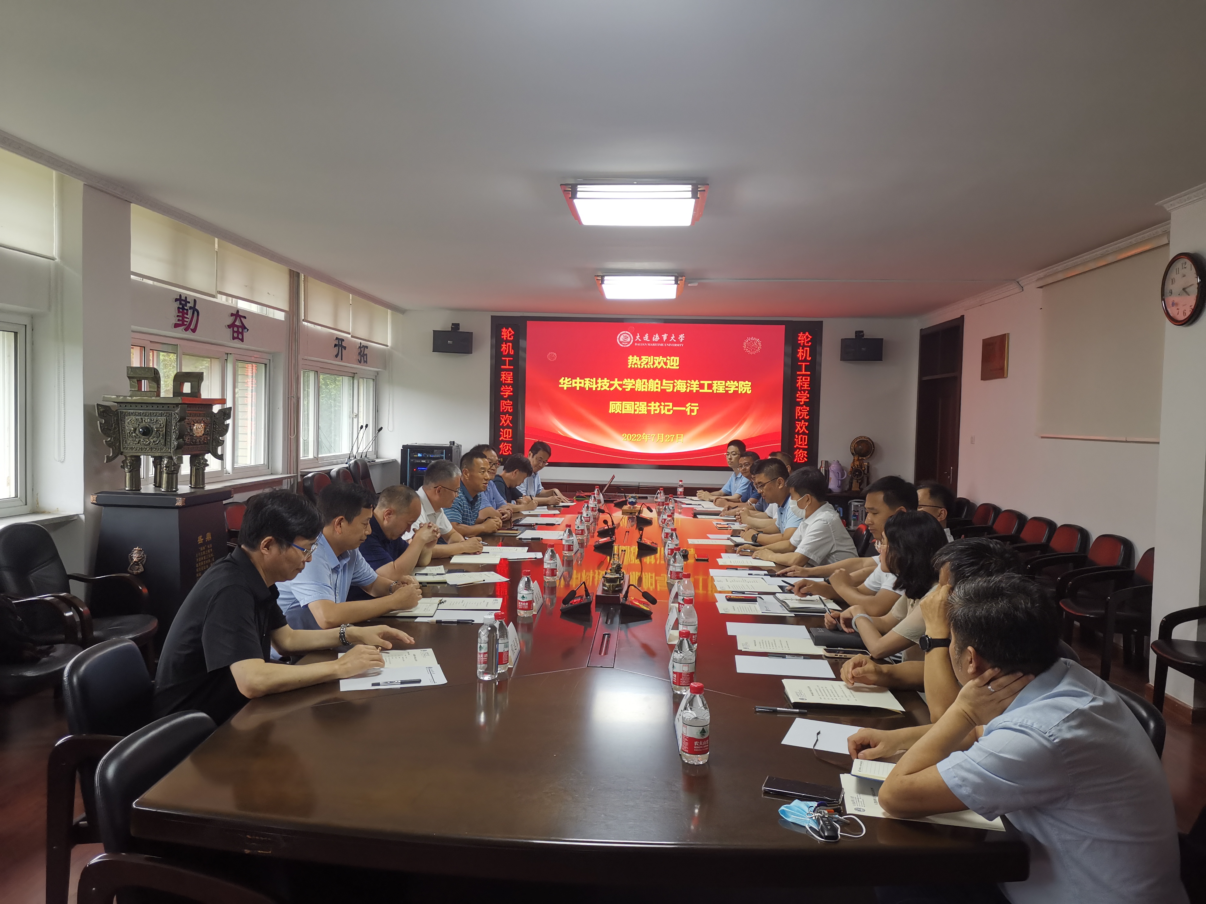 7月27日下午,华中科技大学船舶与海洋工程学院党委书记顾国强一行来访我校。轮机工程学院党委书记毕鹏杰、船舶与海洋工程学院党委书记邹玉堂等参加调研并进行座谈交流。