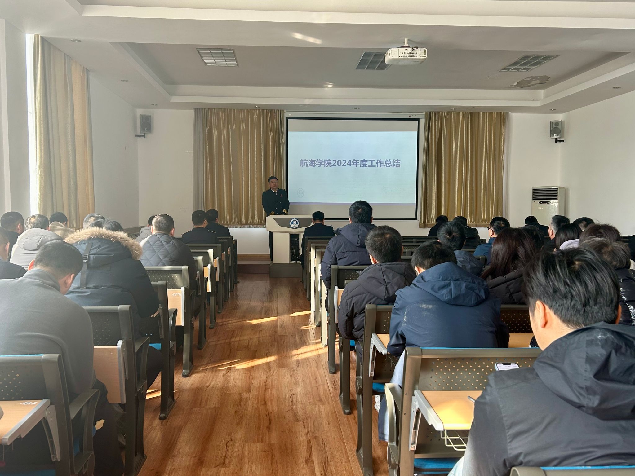 最后,院长章文俊作总结讲话。他首先肯定了学院在2024年各项工作中取得的成绩,特别是聘期取得的突破性和关键性成果。他对照2024年重点工作任务对党建、学科建设、师资队伍建设、科研、人才培养、航海文化建设等方面完成情况进行了通报。他对照聘期改革发展目标与年度工作重点要求,深入分析了当下制约学院高质量发展的突出问题并有针对性地部署了2025年学科、科研、人才等重点工作。他强调,2025年作为新聘期的开局年,学院肩负的重任光荣而艰巨,他激励学院全体职工继续坚定信仰信念、强化使命担当,上下同心、迎难而上,通过担当和实干,推动 “双一流”建设和各项事业不断取得新进展。
