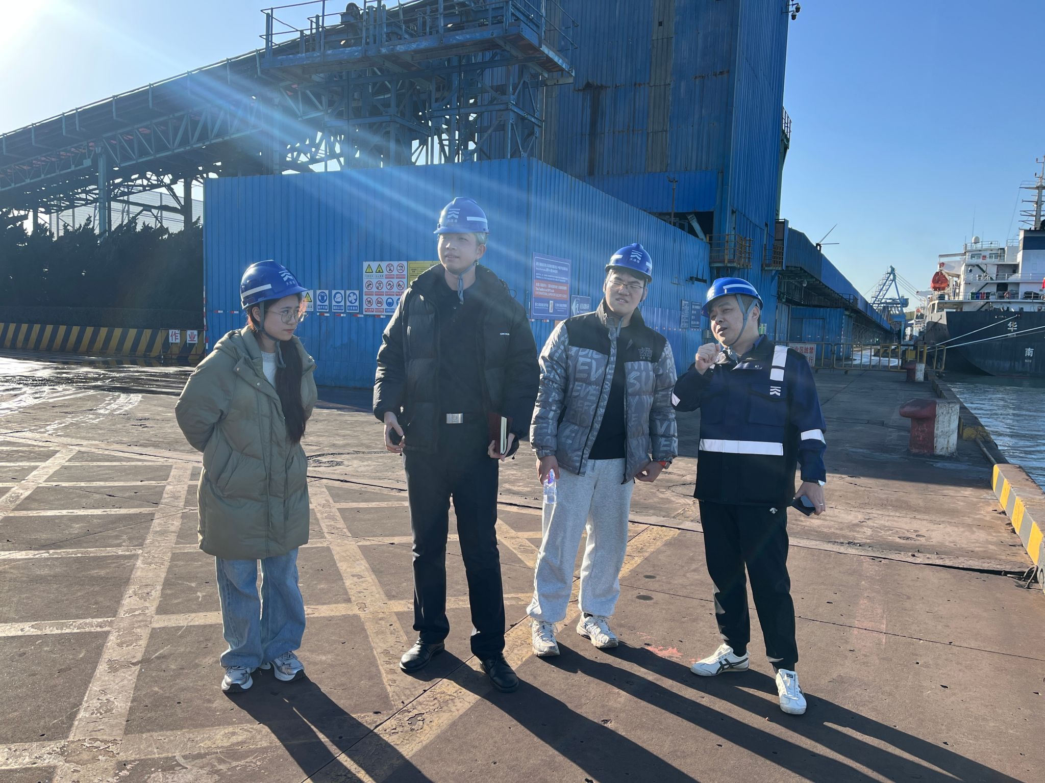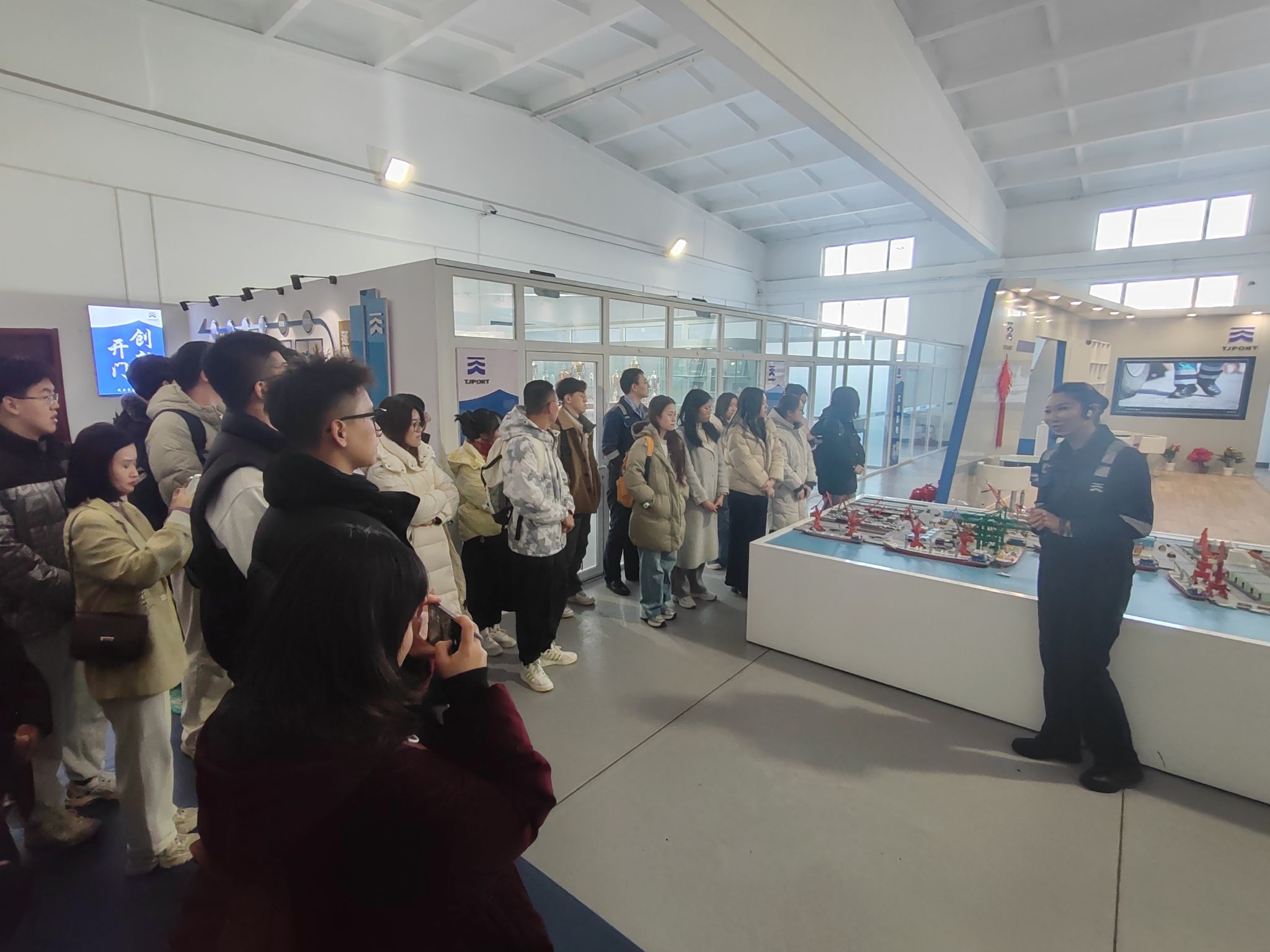 师生一行还走访了天津港第二集装箱码头有限公司、天津港远航国际矿石码头有限公司、天津港联盟国际集装箱码头有限公司、天津港欧亚国际集装箱码头有限公司、天津港煤码头有限公司等天津港集团下属子公司。双方就公司主营业务、发展方向与态势、近年招聘情况、企业人才发展以及毕业生任职表现等内容进行了座谈交流。同时,企业组织现场观摩港口前沿智能化、绿色化的作业过程,让师生直观感受天津港集团的现代化发展水平。