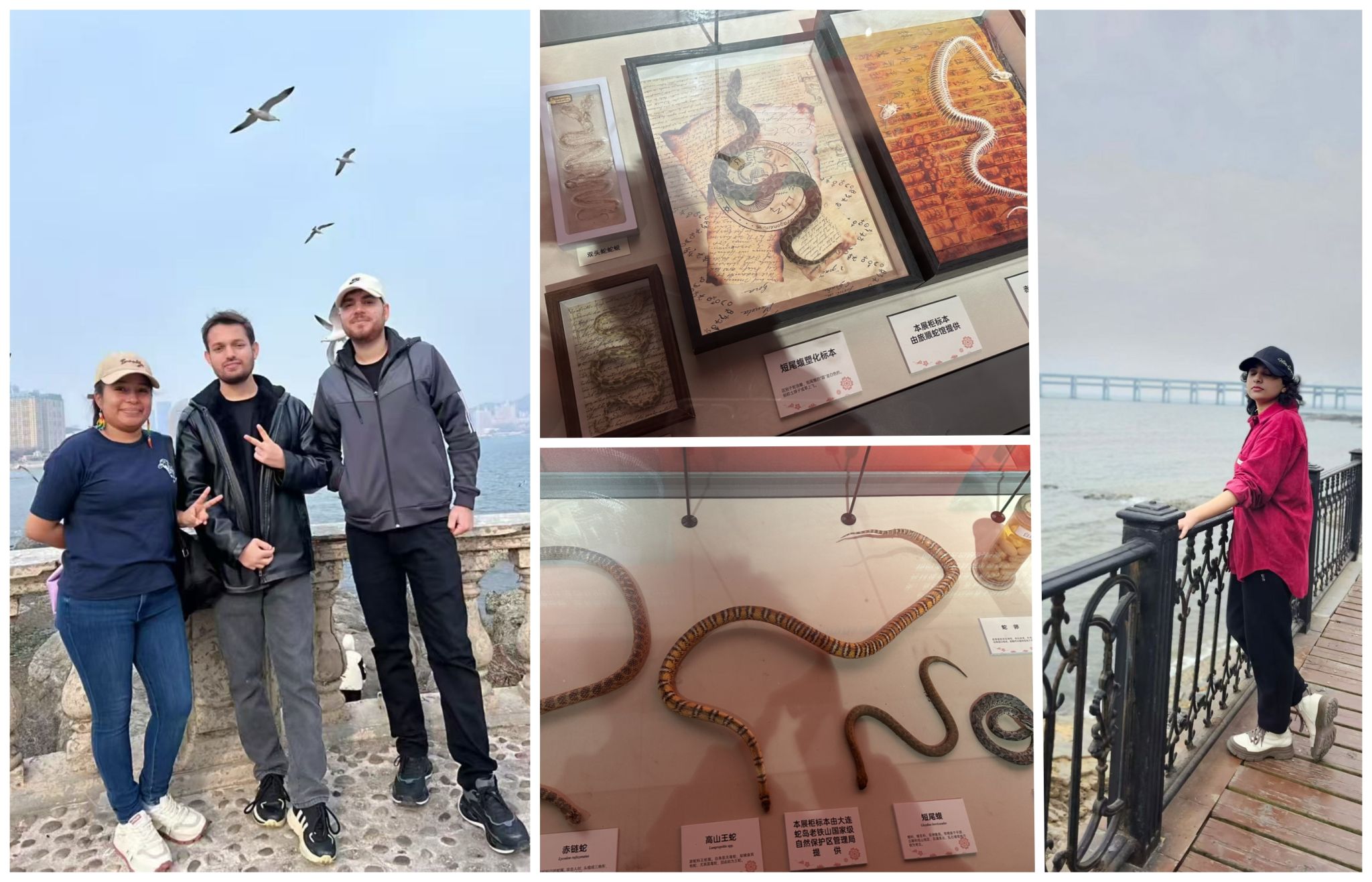 正值乙巳蛇年,博物馆专门设置了蛇类展厅,留学生们津津有味地听着志愿者讲述中国蛇年、十二生肖等传统文化故事,对中国的人文风俗有了更加深刻的理解。走出博物馆,来到黑石礁海边,迎着清新的海风、踏上嶙峋的礁石,同学们与海鸥互动、与海浪对话,再一次感受到人与海洋、与自然的相互依存、密不可分。