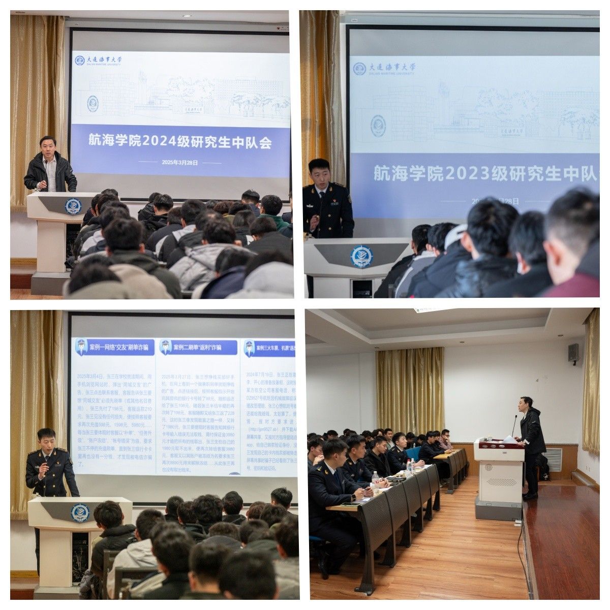 在思想教育方面,学院分年级召开了研究生中队会和主题班会,分别就研究生学风建设、安全稳定、就业指导、心理健康及综合测评等工作进行部署推进。结合学校研究生管理最新要求,经学院奖学金评定委员会研究,全面修订了《大连海事大学航海学院研究生国家奖学金评定办法》、《大连海事大学航海学院研究生专项奖学金评定办法》和《大连海事大学航海学院研究生综合素质测评实施细则》,以制度建设保障学院研究生培养质量。针对近期高校电诈频发的问题,在中队会上专题开展研究生群体反诈主题宣讲,结合电诈实际案例进行警示教育,帮助同学们提升反诈意识。