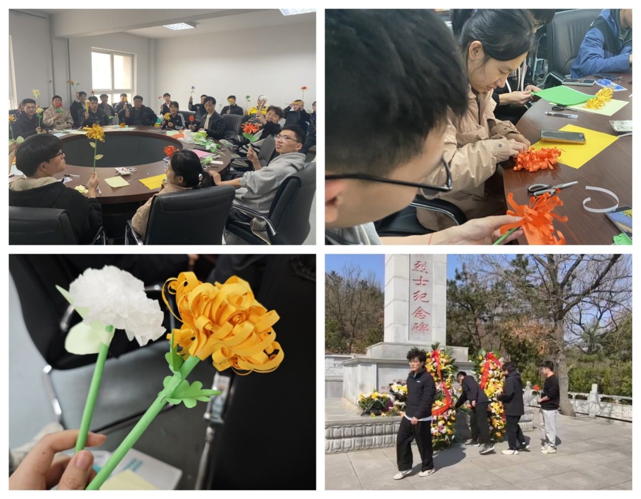 做一束花敬献:支部组织党员、入党积极分子、班团代表,通过亲手制作纸菊,感悟传统文化,以绿色低碳方式寄托哀思,为清明节注入文明新风,并组织前往烈士陵园敬献亲手制作的纸菊,寄托对革命先烈的无限哀思。