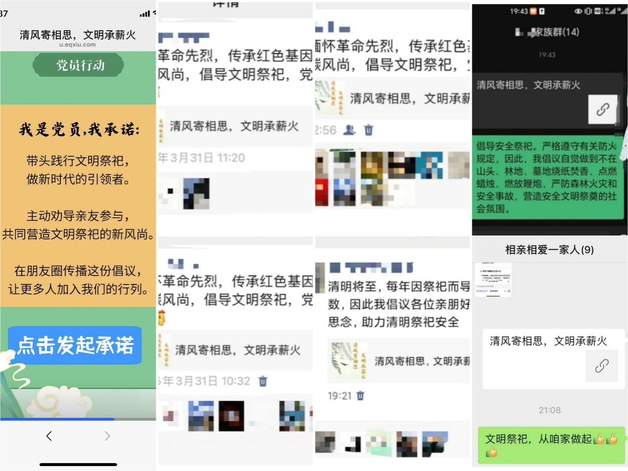 支部精心制作文明祭祀倡议书,清明节前夕依托微信群、朋友圈,党员们率先垂范,积极向家人、亲朋好友发起文明祭祀倡议,带动班团成员踊跃响应。此次线上活动,累计参与超300余人次,支部党员签署文明祭祀承诺书60余份。
