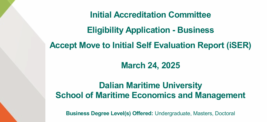 近日,我校航运经济与管理学院收到国际商学院联合会(AACSB)初始认证委员会(IAC)的正式通知,学院的资格认证申请(Eligibility Application,EA)顺利获批。这标志着我校航运经济与管理学院正式进入AACSB认证的关键阶段,开启了迈向商科教育的国际化的崭新旅程。