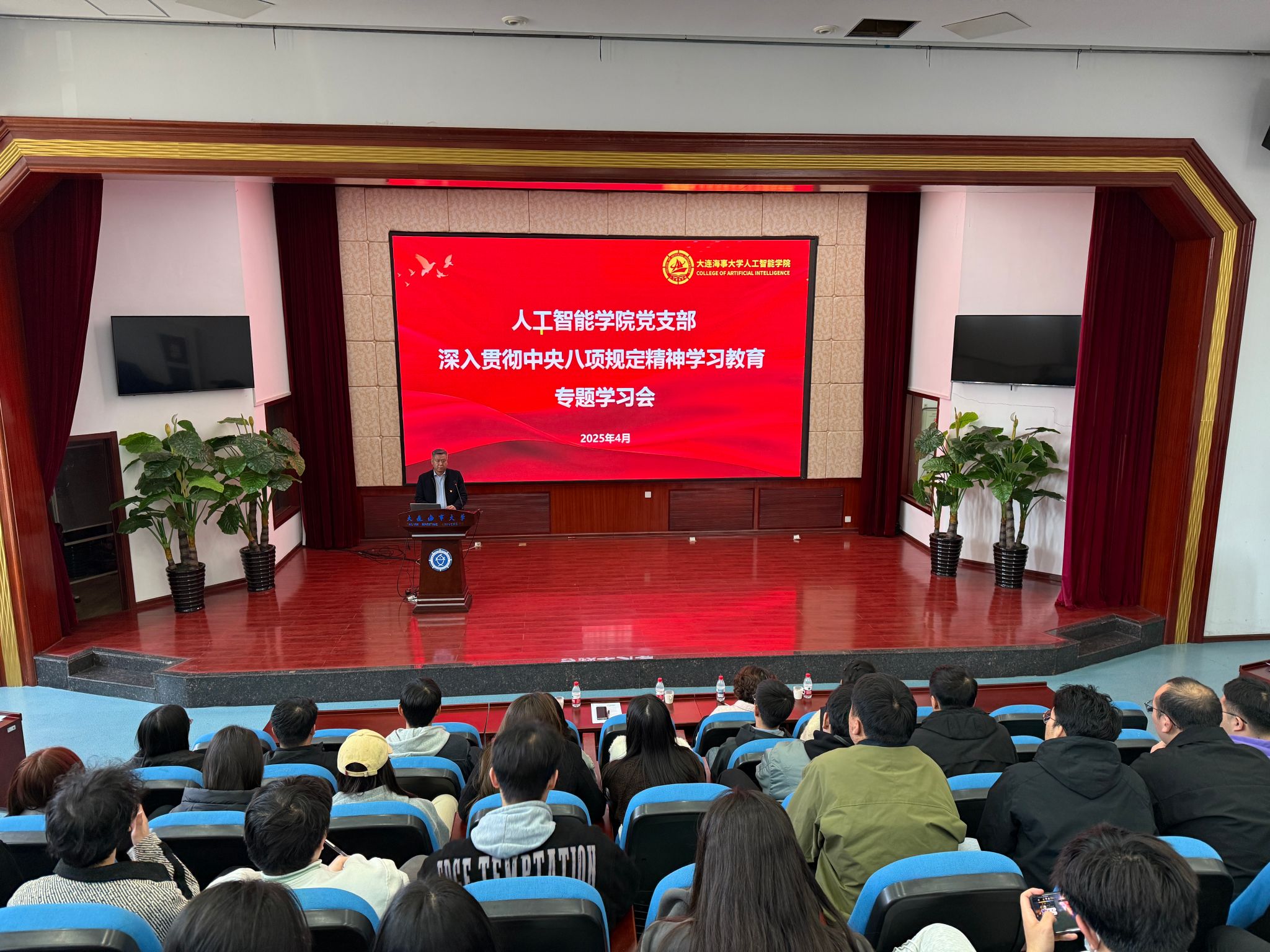 会上,张术佳传达中央党的建设工作领导小组有关会议精神、《中共中央办公厅关于在全党开展深入贯彻中央八项规定精神学习教育的通知》、交通运输部党组会暨党建工作领导小组(党风廉政建设和反腐败工作领导小组)会议(扩大)精神、学校党委召开党委党的建设和全面从严治党工作领导小组(扩大)会议精神,并对《中共大连海事大学人工智能学院支部委员会关于开展深入贯彻中央八项规定精神学习教育的实施方案》进行部署安排。他强调,学习领会和贯彻落实中央八项规定及其实施细则精神,要坚持聚焦主题、简约务实,一体推进学查改,坚持融入日常、抓在经常,确保学有质量、查有力度、改有成效。