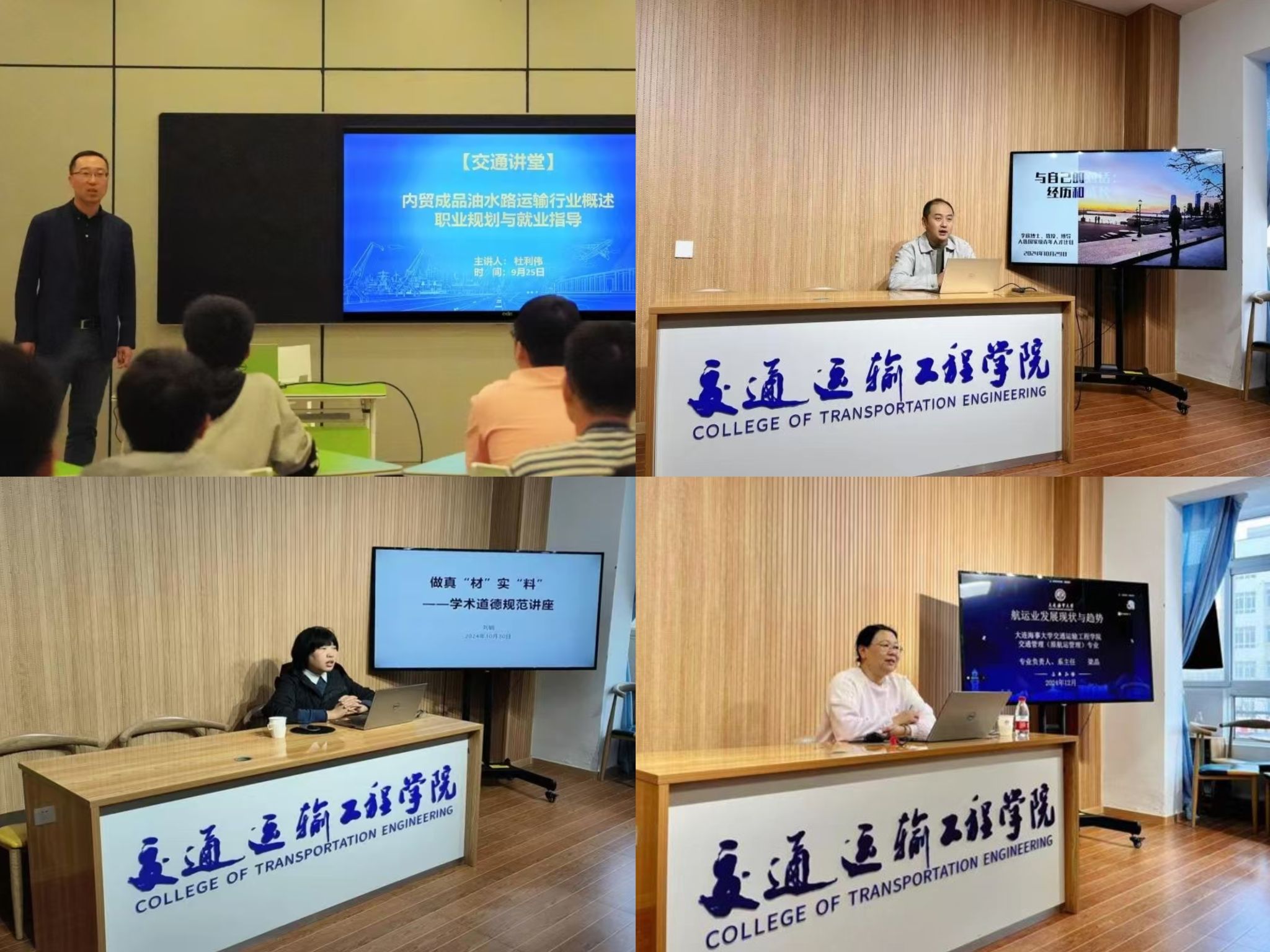 专家学者们根据学生发展所需,围绕不同主题,为学子们呈现了多维立体的知识图谱。2006届国际航运专业校友杜利伟作《内贸成品油水路运输行业概述》专题讲座,从主要航线、港口及运输对象等角度展开讲解,帮助与会学生进行职业生涯规划与就业指导;学院李欣教授结合自身科研经历带来《与自己的对话:经历和成长》专题讲座,鼓励同学们要心怀国之大者,勇于承担历史使命,为科技强国和科技创新进步作出贡献;材料系主任刘娟教授围绕材料学科发展现状和未来前景,带来《做真‘材’实‘料’》学业发展专题讲座,对“如何做有真‘材’实‘料’的材料人”提出建议,针对同学们提出的就业发展和学术研究等方面的问题逐一解答;交通管理系主任梁晶副教授作《航运业发展现状与未来趋势》专题讲座,从航运的运行逻辑、关键市场要素及重要运输主体三个方面展开讲述,列举并介绍了往届优秀毕业生代表,以此来激励同学们拼搏进取,脚踏实地。