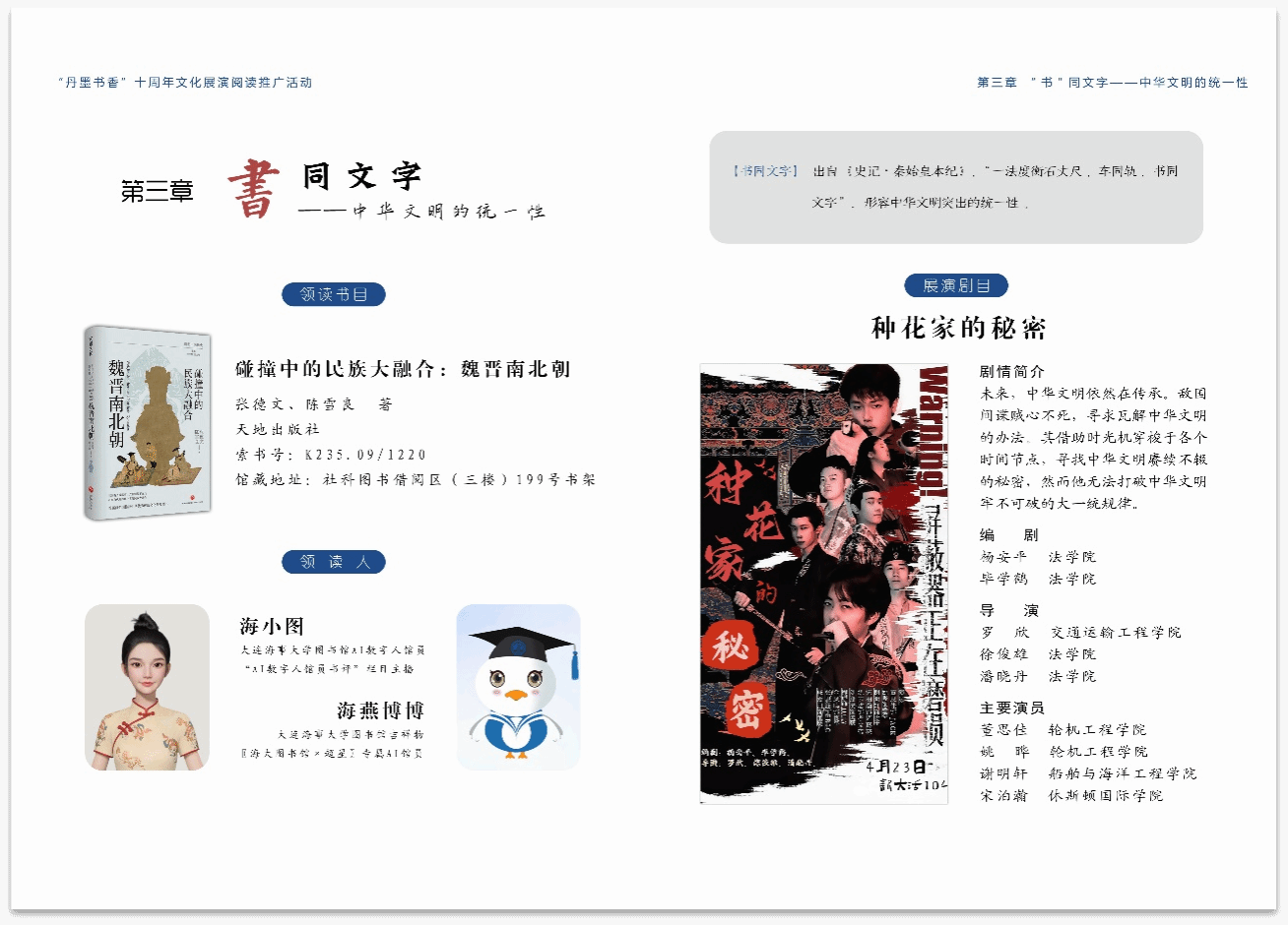 “丹墨书香”文化展演阅读推广活动由学校党委宣传部、党委学生工作部、团委、图书与档案馆主办,十年来旗帜鲜明地发挥思想引领和文化引领作用,成为滋养师生读者心灵、培育文化自信的重要阵地,是海大师生喜闻乐见的阅读推广品牌。
