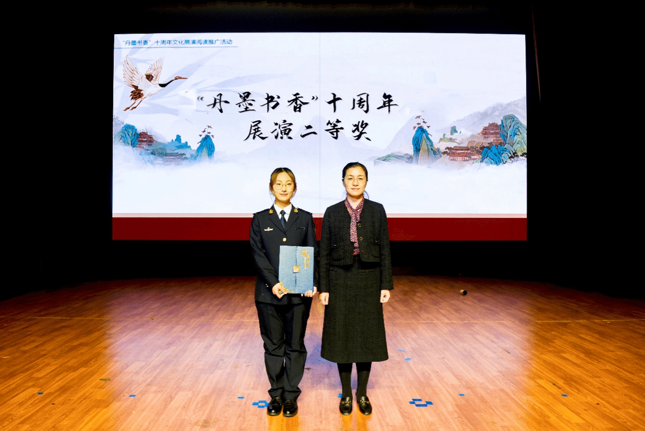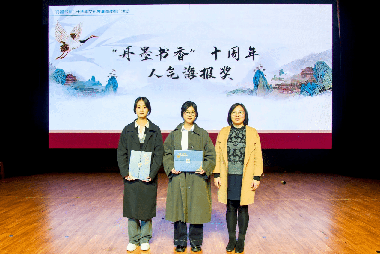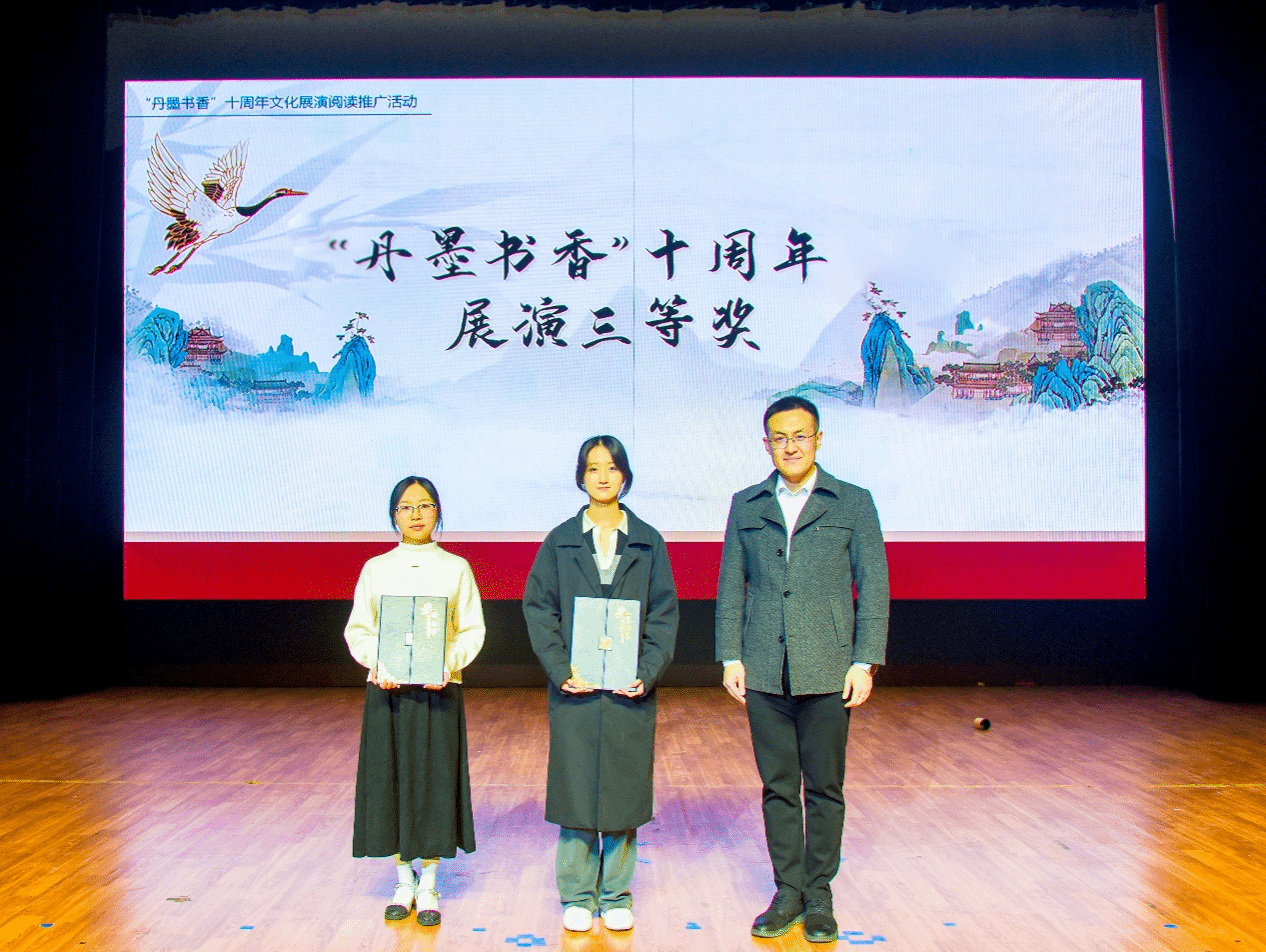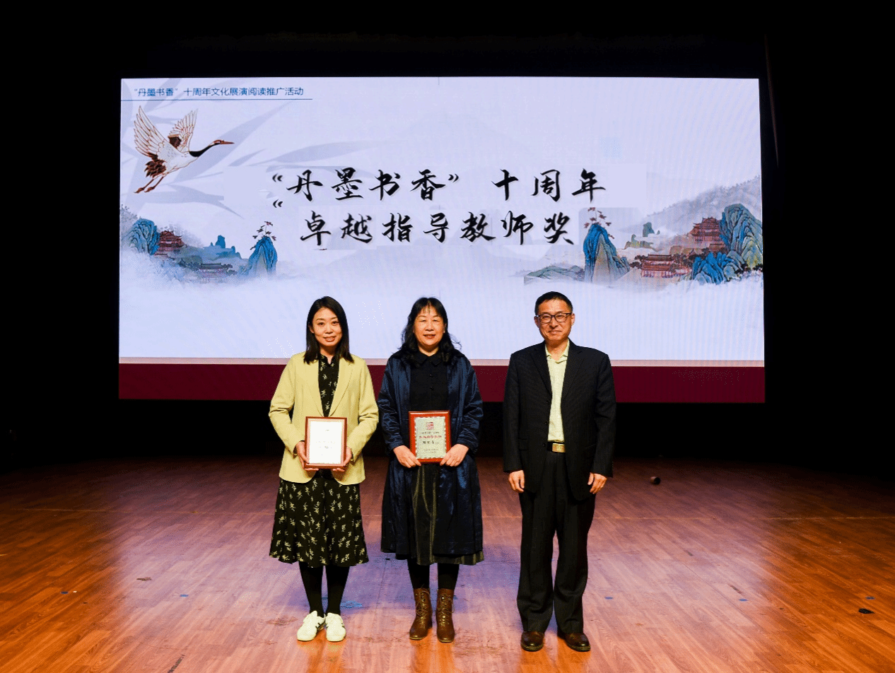 活动中向为历届“丹墨书香”展演作出贡献的指导老师颁发了“丹墨书香”十周年卓越指导教师奖。超星集团副总经理王允亚为受表彰老师颁奖。