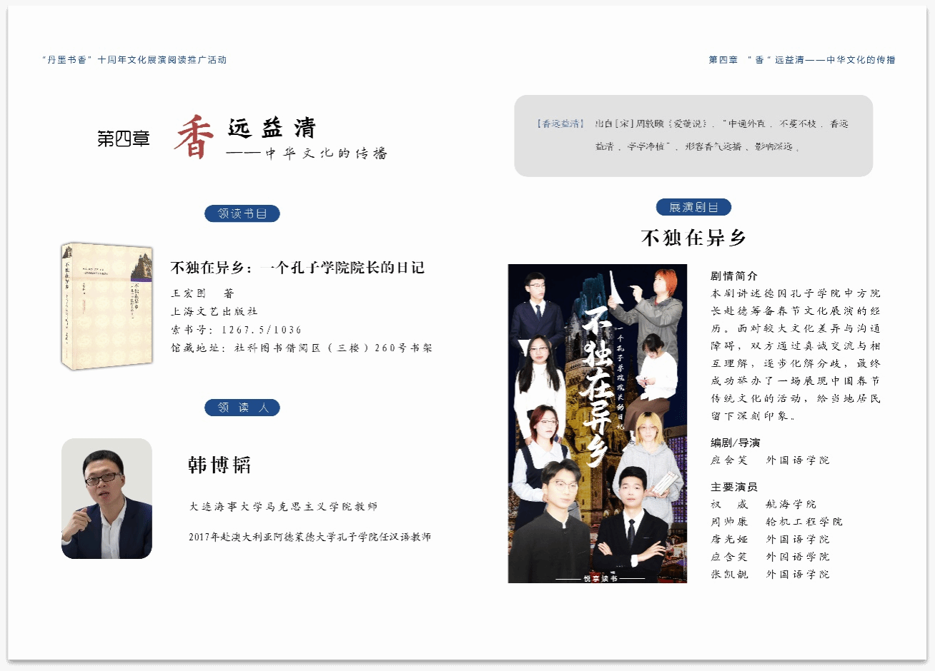 在第四篇章,马克思主义学院教师、曾赴澳大利亚阿德莱德大学孔子学院任对外汉语教师的韩博韬老师通过视频分享了阅读馆藏图书《不独在异乡:一个孔子学院院长的日记》的感受,“不独在异乡”剧组展演了反映一位孔子学院中方院长赴德筹备春节文化活动故事的作品。