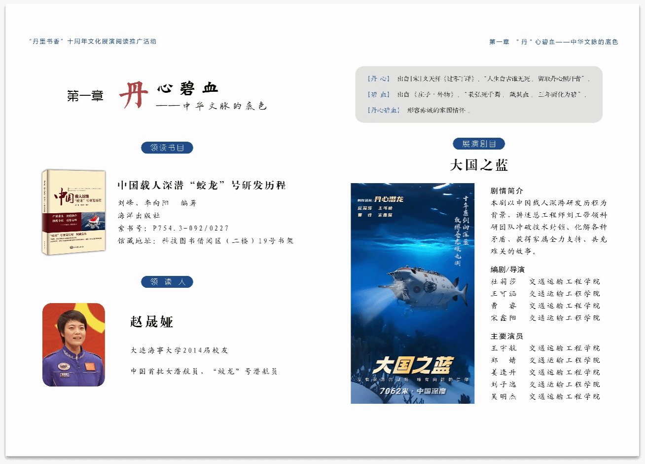在第一篇章,大连海事大学2014届校友、中国首批女潜航员、“蛟龙”号潜航员赵晟娅,以视频领读方式分享了阅读馆藏图书《中国载人深潜“蛟龙”号研发历程》的感受,“大国之蓝”剧组展演了反映中国载人深潜研发团队攻坚克难事迹的剧目作品。