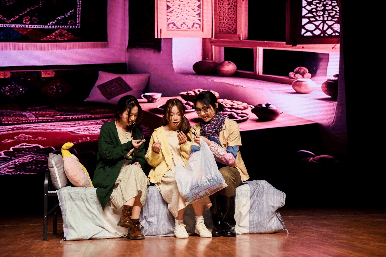 在第二篇章,公共管理与人文学院2022级行政管理专业、来自新疆的维吾尔族学生迪丽努尔·艾尼瓦尔通过视频分享了阅读馆藏图书《我的阿勒泰》的感受,“雪线上的耳朵”剧组展演了反映新疆阿勒泰地区生态改善和少数民族文化的剧目作品。