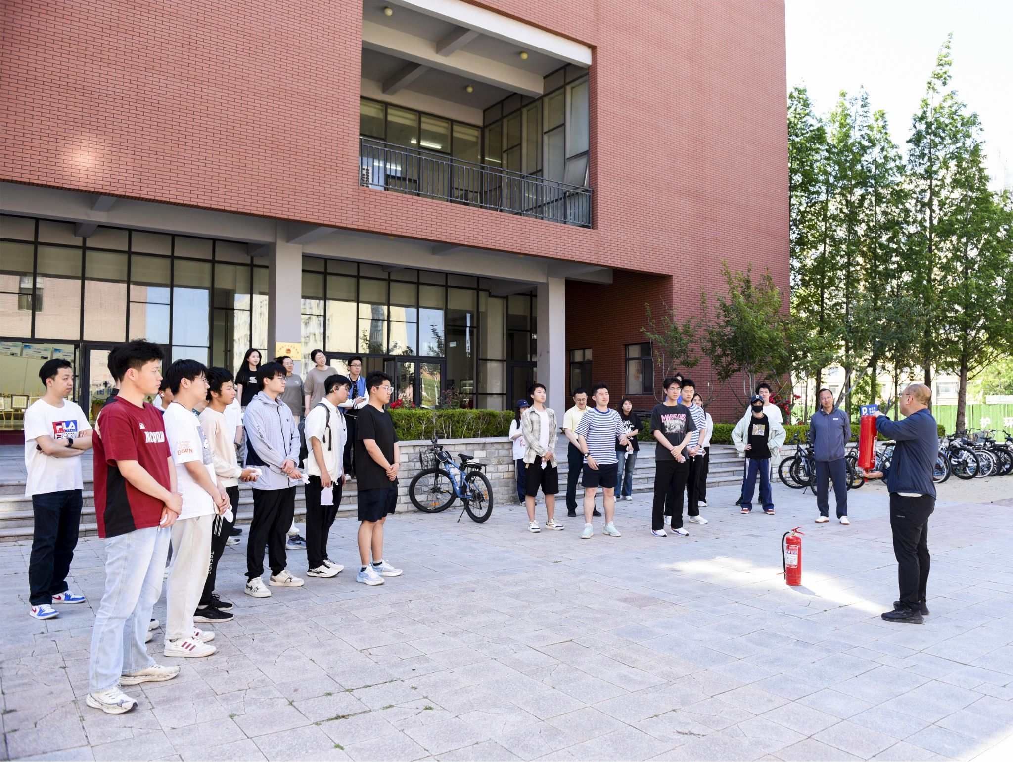 14:30分,现场指挥创新创业学院副院长石淼发出演练开始指令,参演师生模拟火灾发生时的紧急场景,按照应急预案迅速进行疏散逃生,在3分钟内有序撤离至楼外安全区域。应急疏散演练结束后,参演师生在大学生活动中心楼外进行灭火器实操,练习使用灭火器的 “提、拔、握、压” 等规范操作步骤,保卫处赵通老师进行现场指导。