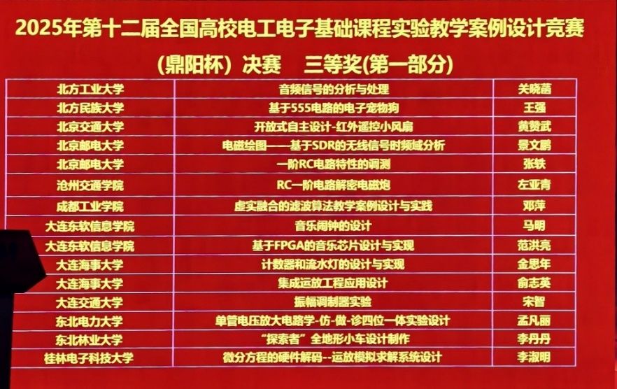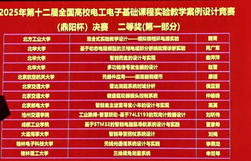 近日,第十二届全国电工电子基础课程实验教学案例设计竞赛(鼎阳杯)于哈尔滨工程大学落下帷幕。我校教师获得全国二等奖1项,三等奖2项,获得北部赛区一等奖3项,二等奖5项,三等奖4项,学校获得优秀组织奖1项。