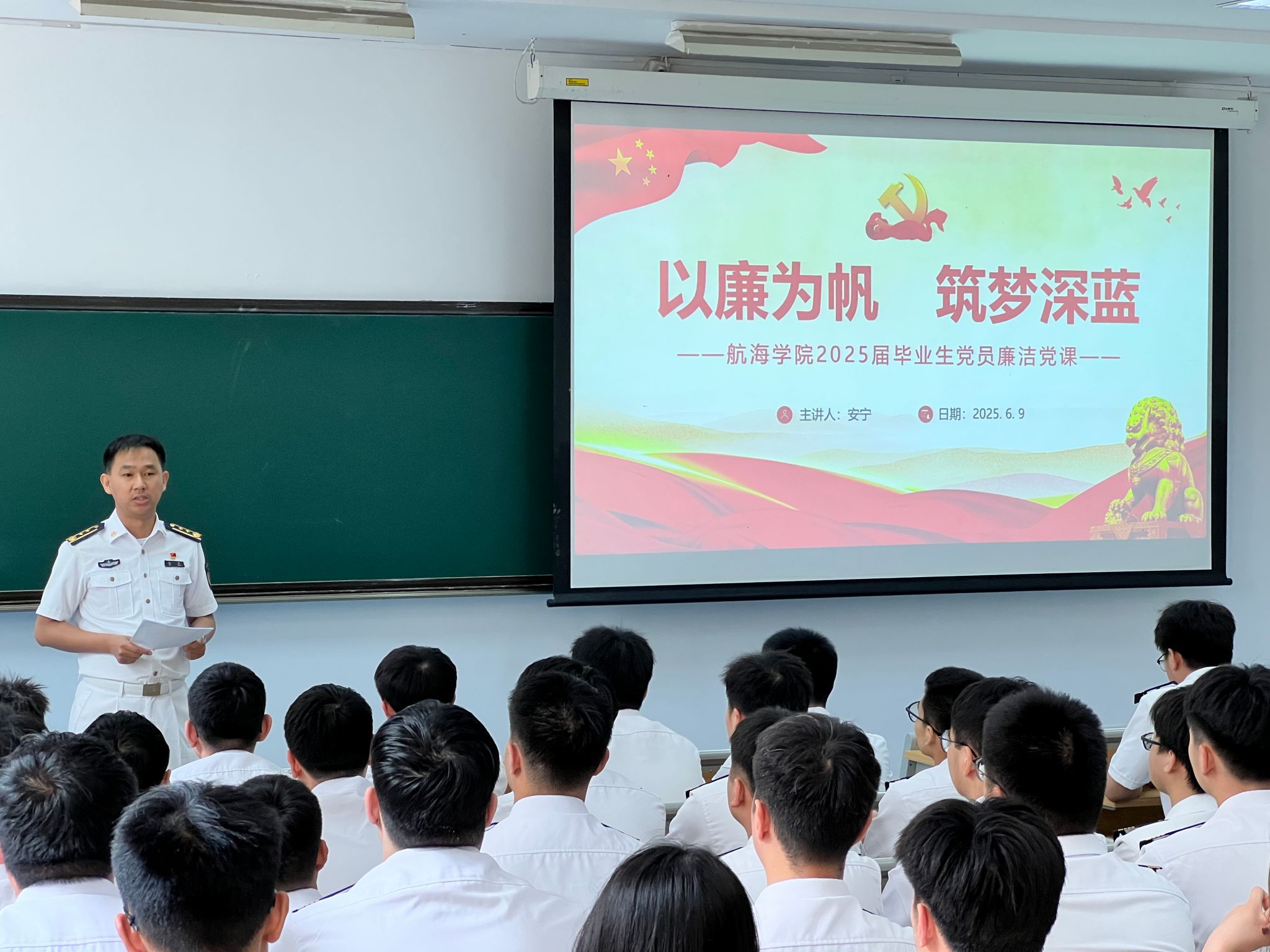 为进一步推动深入贯彻中央八项规定精神学习教育,增强毕业生党员廉洁意识,教育引导毕业生党员扣好廉洁从业“第一粒扣子”,6月9日,航海学院组织开展2025届毕业生党员廉洁教育活动。学院党委副书记、纪委书记安宁以“以廉为帆·筑梦深蓝”为主题,为2025届毕业生党员讲授廉洁教育专题党课。学院2025届毕业生党员参加活动,活动由指导员柴壮主持。