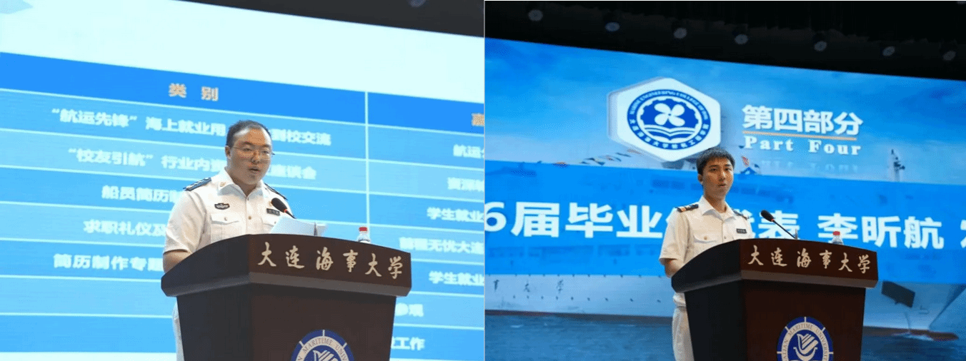 李昕航代表毕业生发言,他首先向学校和学院的悉心培养表达感谢,同时表示将不忘母校教诲,胸怀“国之大者”,扎根航运事业,锤炼过硬本领,将个人理想融入交通强国建设,以青春之我书写守卫祖国蓝色国土的绚丽篇章。
