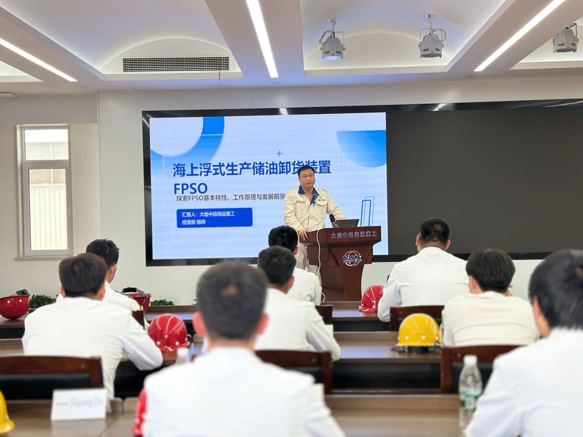 同学们在大连中远海运重工有限公司新会议中心了解了企业发展历史及主要在建项目。企业经营部经理甄峰为同学们作《海上浮式生产储油卸货装置(FPSO)》专题讲座,他结合企业承建的多个国内外海洋工程重点项目,系统地讲解了FPSO作为“海上石油工厂”的核心技术原理、建造难点及全球市场趋势。讲座中,同学们深切感受到国之重器国产化的重要性和必要性。