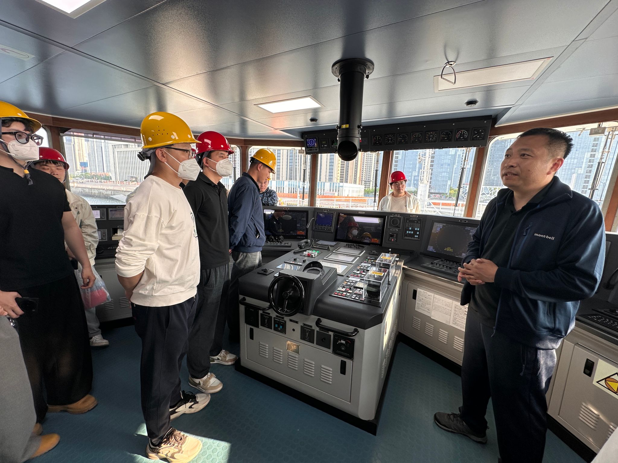 最后,同学们参观了由中远海运重工有限公司为我校建造的全球首艘集自主航行、远程控制和自主操作功能为一体的科研与教学实训新型船舶“新红专”轮,详细了解了其内部构造与先进功能,让同学们切身感受到了中国船舶工业的硬核实力,也明确了未来科研攻关的方向。