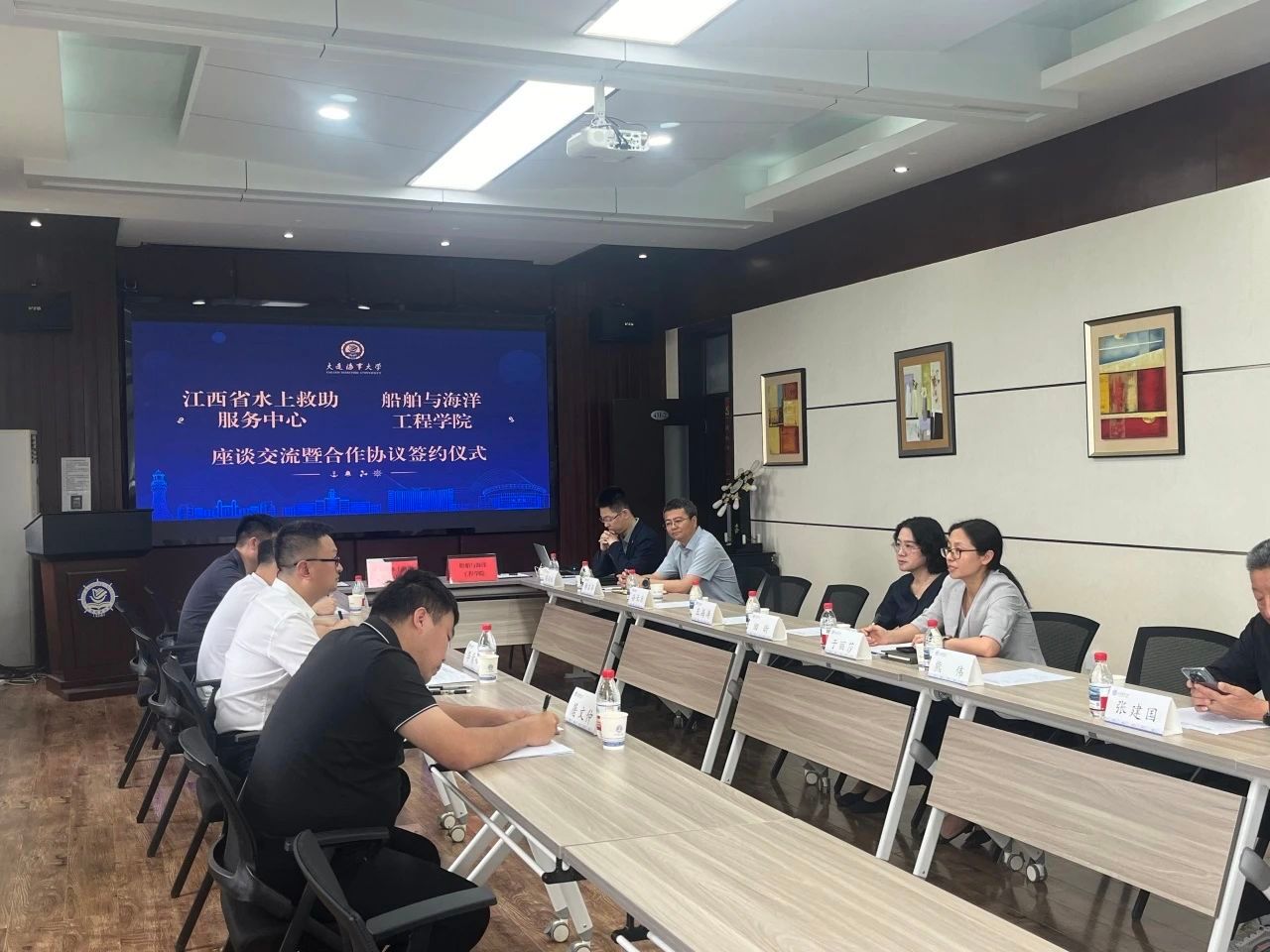 签约后,双方就合作细节展开深入交流。韩吉昂分享学院在救捞领域的科研成果与研究生培养模式,重点展示水下机器人、应急打捞装备等研究方向。侯远杭系统介绍学院专业建设体系,突出救助与打捞工程专业作为国家级卓越工程师培养计划的特色优势。孙长乐、熊伟、张增猛等教授分别介绍水面应急救援、水下智能装备等课题进展,与中心代表就鄱阳湖水域救助难点展开技术研讨。