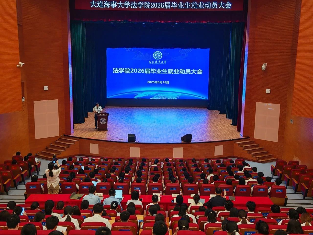 为进一步深入贯彻落实学校关于学生就业工作各项工作部署,精准做好学生就业指导与服务工作,大力促进法学院2026届毕业生高质量充分就业,6月18日下午,大连海事大学法学院2026届毕业生就业动员大会在大学生活动中心104报告厅举行。法学院院长朱作贤、党委书记吕海宁、副院长李国强、副院长黄芬、副院长曹兴国、党委副书记兼副院长丁祖山以及法学院2007级校友、北京市炜衡(大连)律师事务所海事海商法律事务部主任、合伙人谢静出席会议。会议由法学院团委书记高梓博主持。