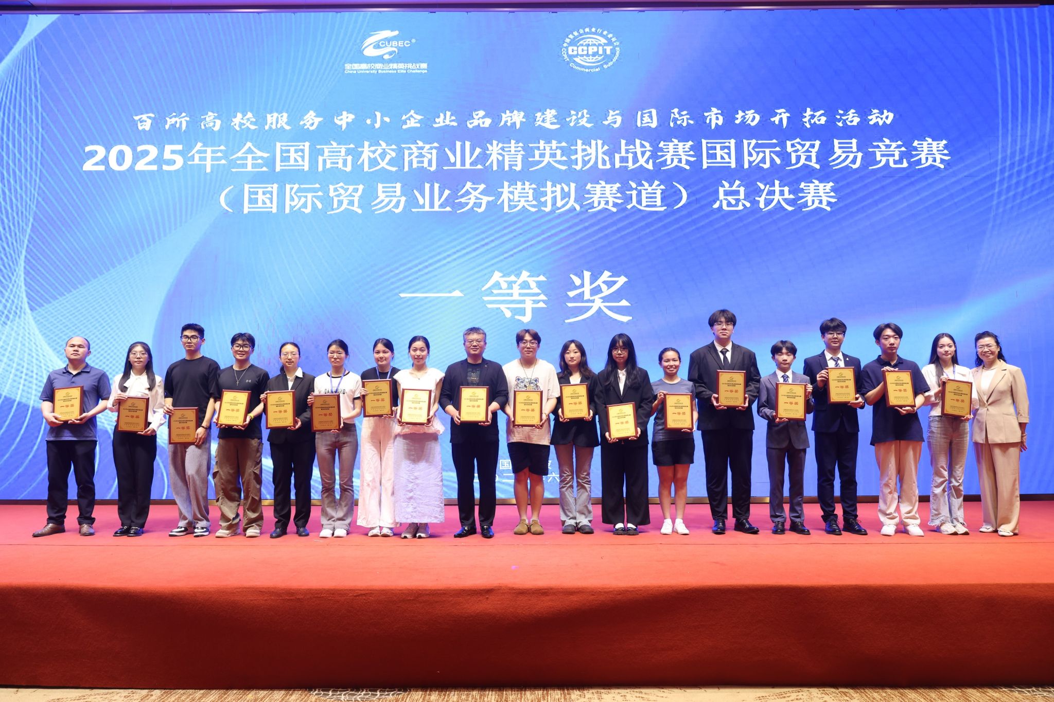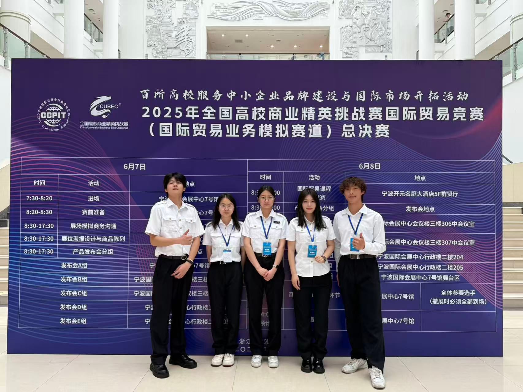 近日,由中国贸促会商业行业委员会、中国国际商会商业行业商会和中国商业经济学会联合主办的2025年全国高校商业精英挑战赛国际贸易竞赛(国际贸易业务模拟赛道)总决赛在宁波国际会展中心成功举办。我校共有3支队伍荣获一等奖,4支队伍荣获二等奖,1支队伍荣获三等奖,我校荣获“最佳院校组织奖”。