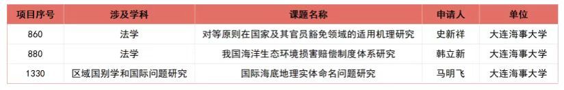 近日,全国哲学社会科学工作办公室公示了《2025年国家社会科学基金年度项目立项名单》,大连海事大学法学院韩立新教授、马明飞教授、史新祥副教授获2025年度国家社科基金一般项目立项。
