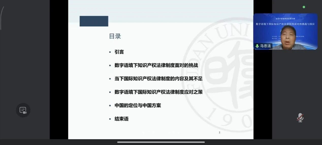 10月11日晚,马忠法教授在讲座中系统阐述了国际知识产权法律制度的内容变化及发展趋势,并从完善知识产权制度、促进知识产权运用以及维护国家安全和利益等角度提出我国的应对措施。他强调:“数字语境下的知识产权博弈已从条款之争升级为制度模板之争,中国应为全球提供不同于美式、欧式的‘第三方案’,实现从被动对标到主动输出的范式转换。”
