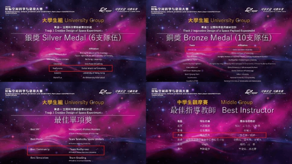 本届赛事自今年4月启动,设置“空间科学实验创意设计”“空间科学载荷创新设计”两大核心赛道。历经预赛作品提交、入围名单公示、方案优化、专家培训、社群共建等多轮筛选,我校RadSynova 团队在“空间科学实验创意设计”赛道获得单项最佳社群奖与国际银奖,Win or Cat 团队在“空间科学载荷创新设计”赛道获得国际铜奖,张萌老师获得最佳指导教师奖。