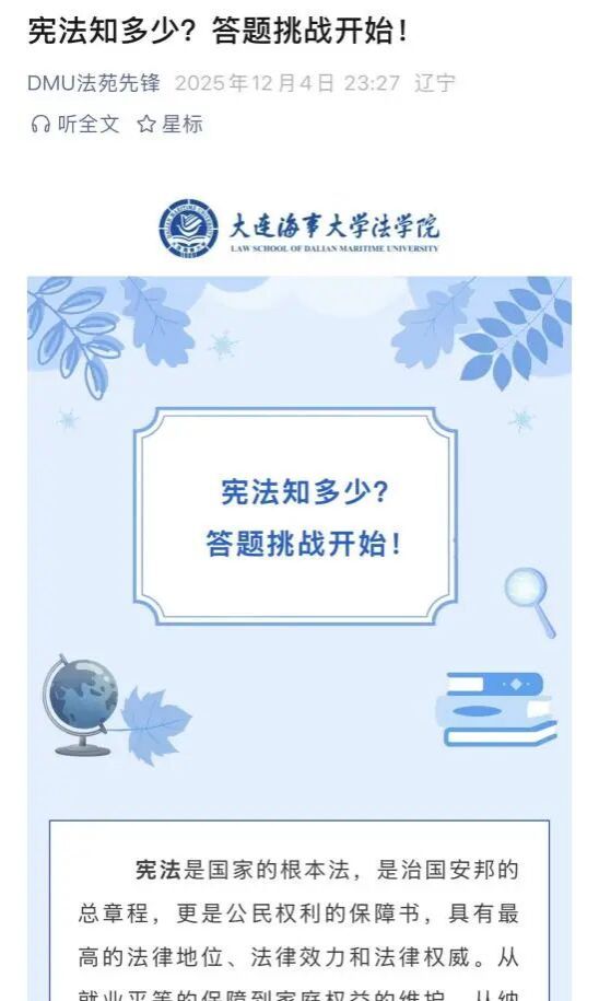 学院依托官方微信公众号平台,在“宪法宣传周”期间推出“‘12·4’国家宪法日|关于宪法,你了解多少?”与“宪法知多少?答题挑战开始!”两篇主题推送,通过系统梳理我国宪法的历史沿革、根本地位、核心原则以及与公民生活密切相关的条款,为读者构建了一个简明而完整的宪法知识框架,并将前期普及的知识点转化为形式多样、富有挑战性的在线问答题目,激发了读者的参与热情,有效提升了普法的互动性和趣味性,在寓教于乐的轻松氛围中,促使读者主动回顾、深入思考,真正实现了宪法知识从“被动接收”到“主动内化”的转变。