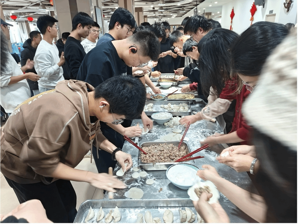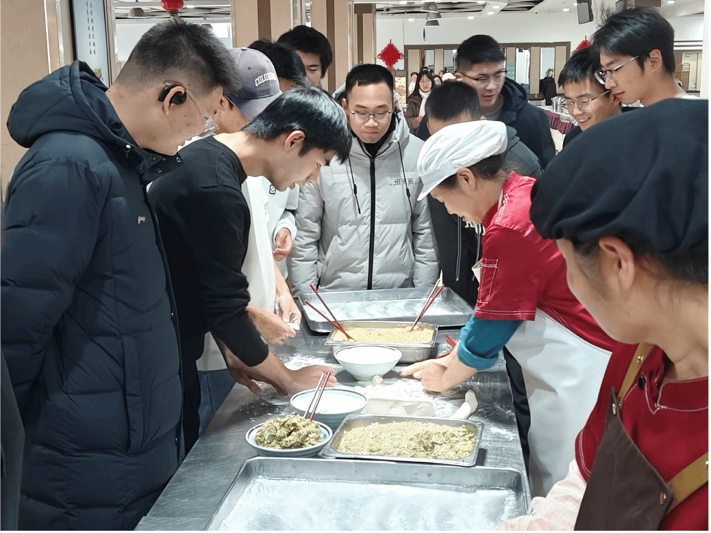 活动现场,同学们在食堂师傅指导下分工协作,有条不紊地擀皮、包馅、摆盘。大家边忙碌边交流家乡元旦习俗、分享学习生活趣事,欢声笑语中,形态各异的饺子陆续成型,暖意弥漫整个食堂。