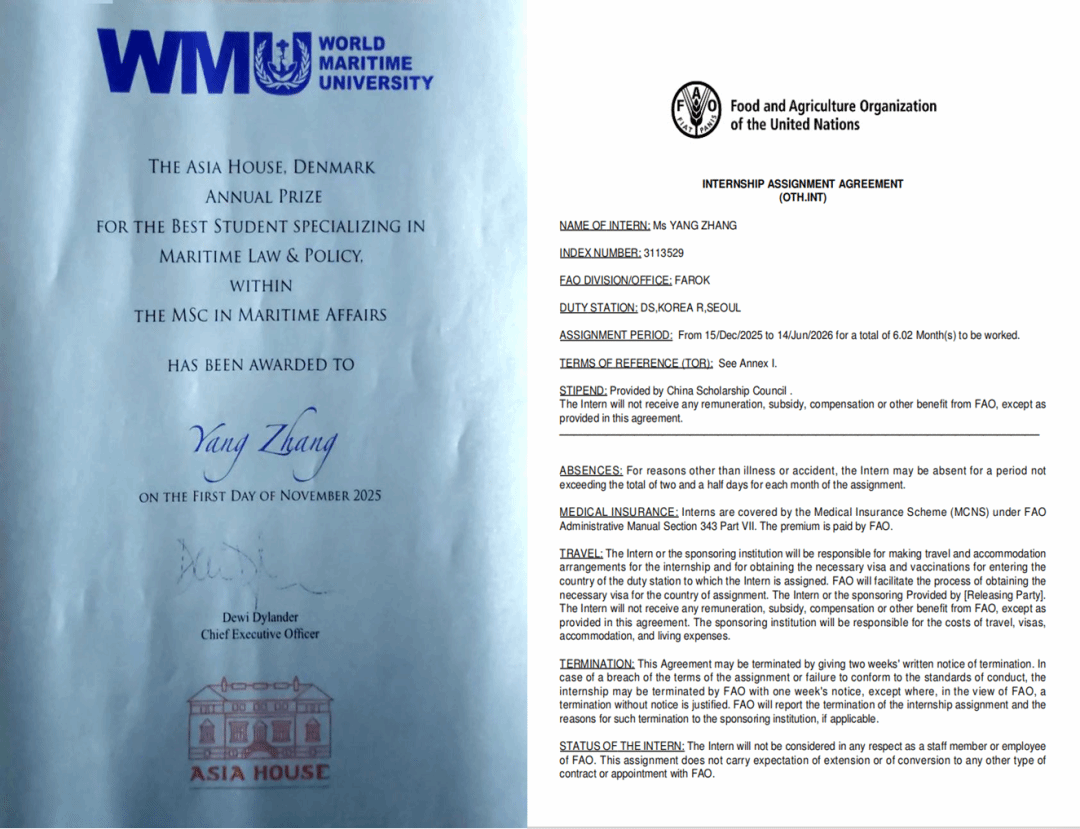 学校“涉海国际组织后备人才培养项目”已逐步成为输送青年人才走向国际舞台的重要通道。特别是首批项目的法学院张洋同学,在世界海事大学学习期间,她系统修读了《国际法、海事公约和国际组织》《海事经济学》等10余门核心课程,完成了兼具理论价值与现实意义的高质量毕业论文,最终在众多国际学子中脱颖而出,被授予“世界海事大学海事法律与政策专业最佳毕业生”荣誉称号。与此同时,她凭借过硬的综合实力,成功取得联合国粮农组织(FAO)实习offer,已在韩国开始为期6个月的实习。