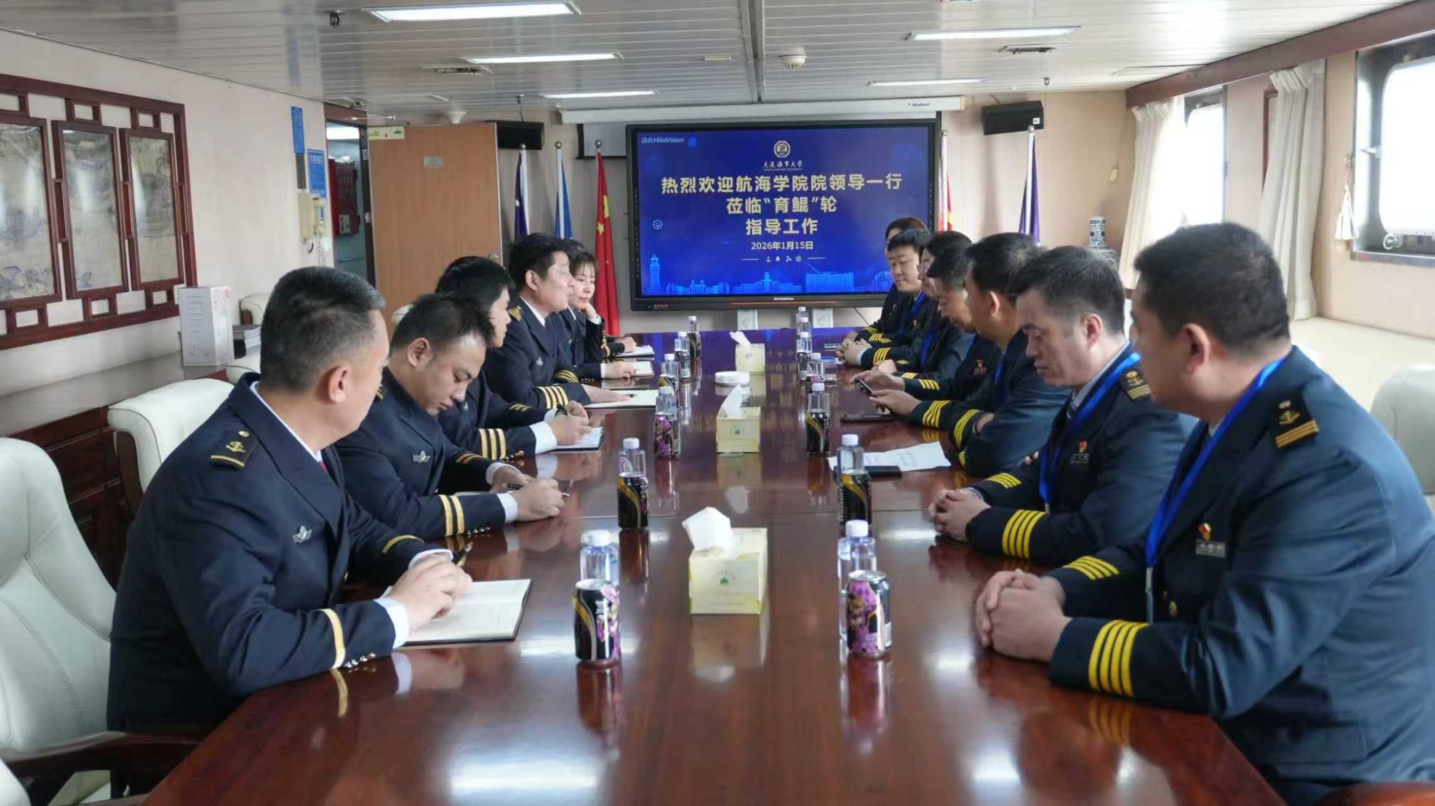 1月15日上午,航海学院领导班子一行专程前往新红专轮和育鲲轮,看望慰问坚守在船的一线职工,送上学院的关怀与温暖。