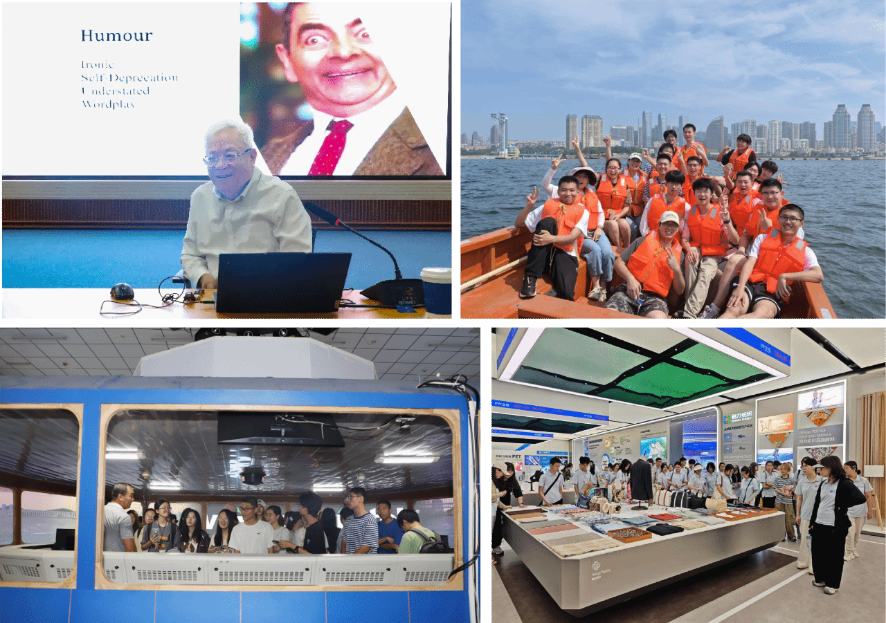 从上到下从左到右分别为:2025年7月小学期课程“英国法律与文化漫谈”讲座、水上求生训练实践、航海模拟器实践、访问恒力(大连)产业园