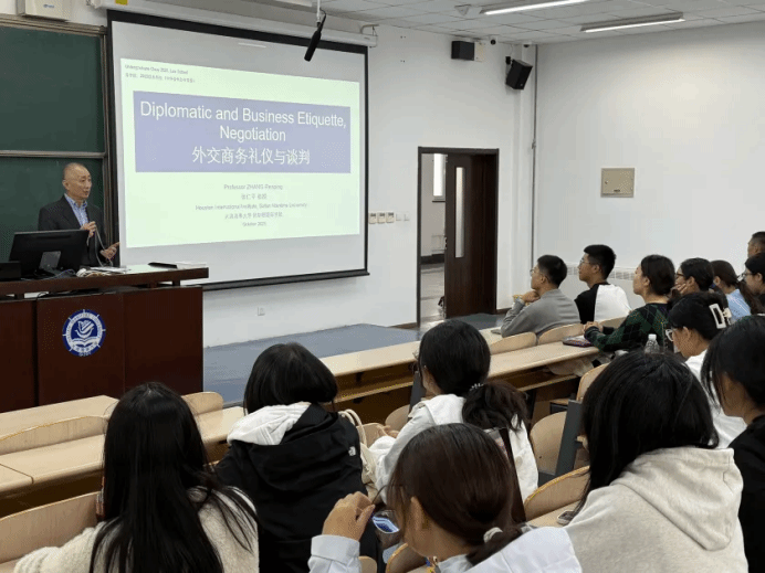 原中国驻英国大使馆外交官、大连海事大学原国际合作与交流处处长张仁平教授全英文讲授“外交商务礼仪与谈判”课程