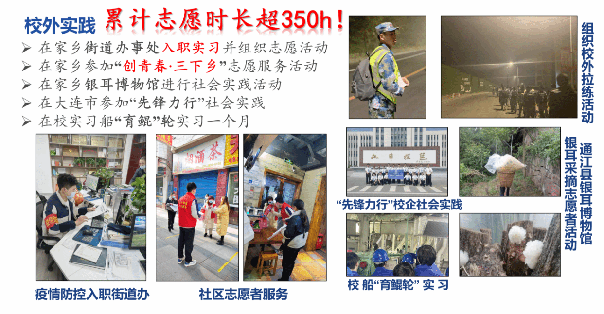假期回到家乡,积极参与和组织各类志愿活动,寒暑假入职基层社区,深入基层工作,“创青春·三下乡”、“返家乡”入职街道办事处。三年来,累计参加志愿服务时长超350小时。