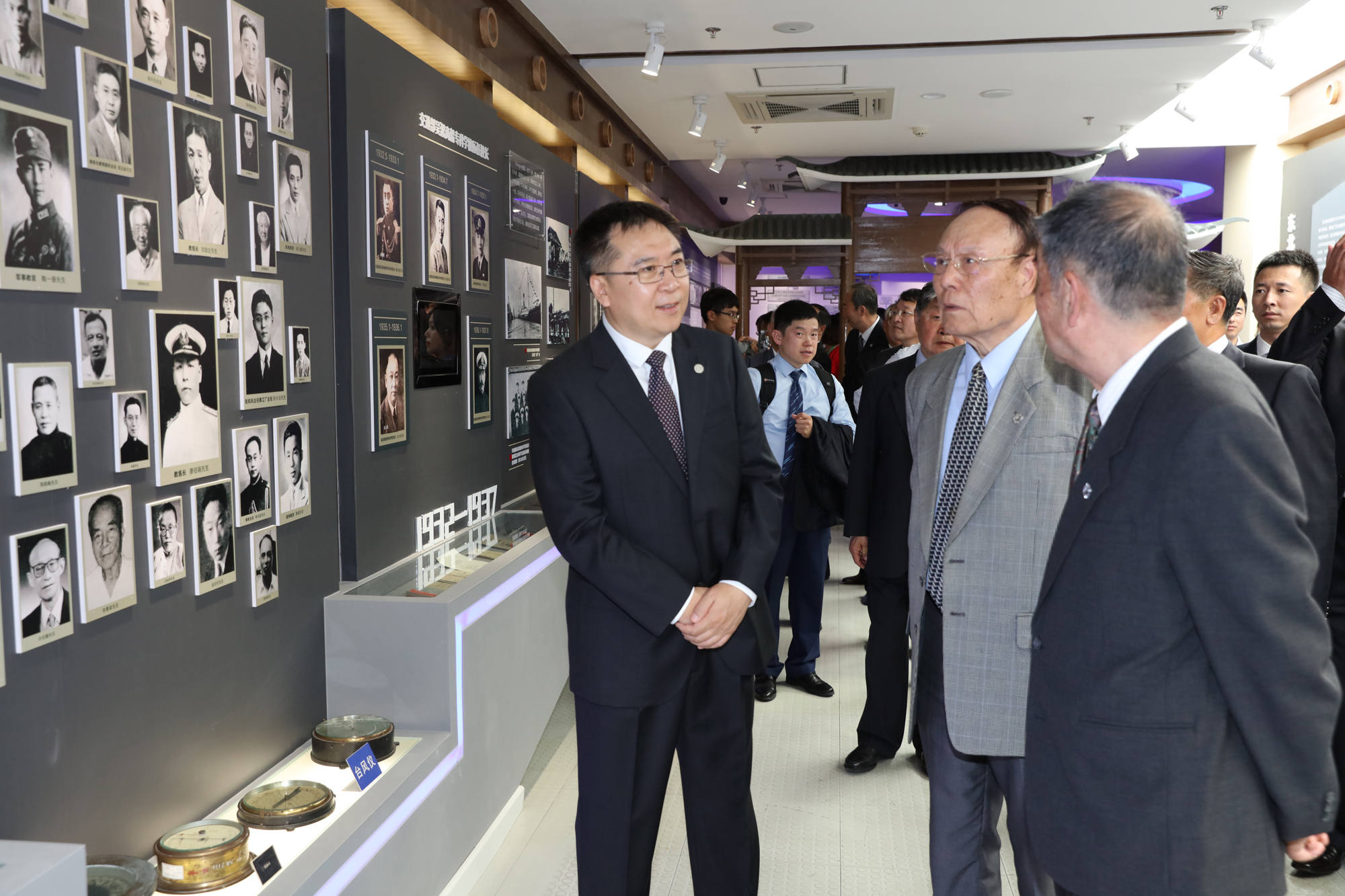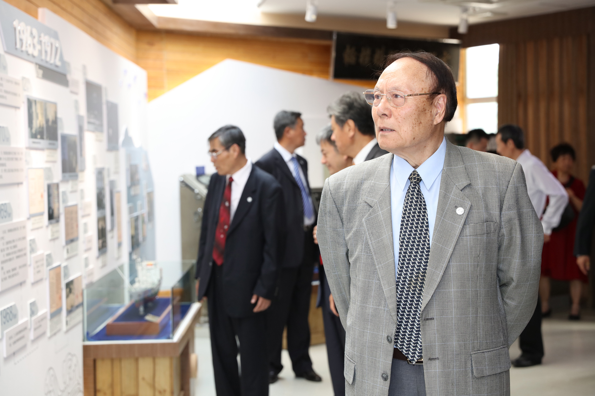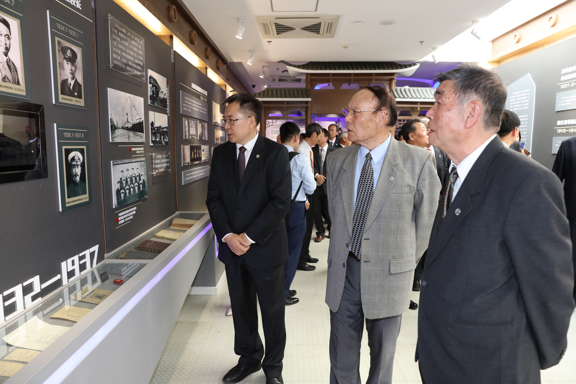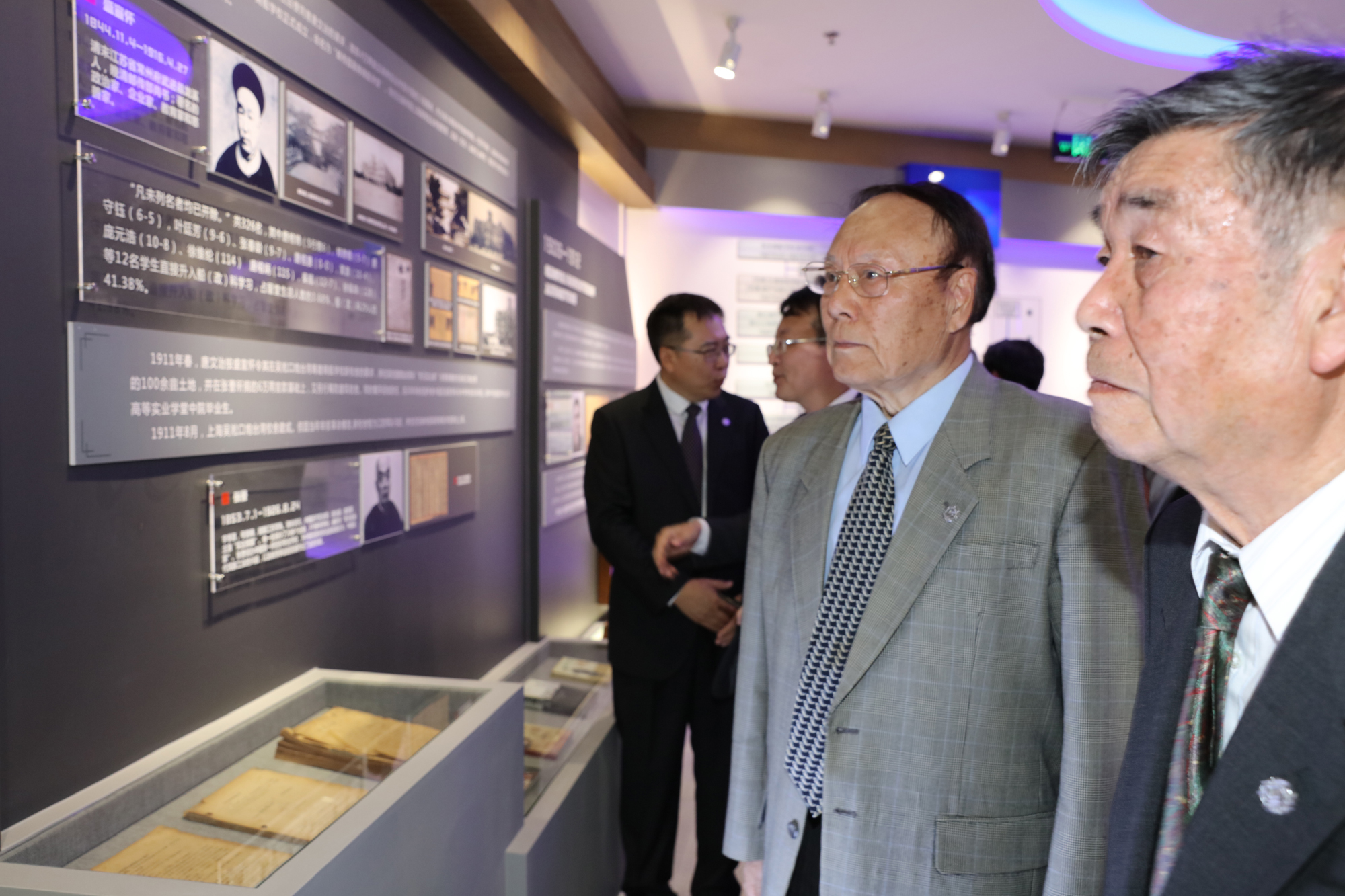 学校老领导司玉琢、郭禹、吴兆麟、王祖温一起为校史展开展揭幕。开展仪式邀请了我校前身上海高等实业学堂首任监督唐文治先生的曾孙唐明德致辞,他带领大家回顾了唐文治先生的治校历史以及唐氏家族为学校发展和我国教育事业所做贡献,并为海大百十诞辰献上诚挚祝福,表达了对海大以及海大人未来发展的美好祝愿。