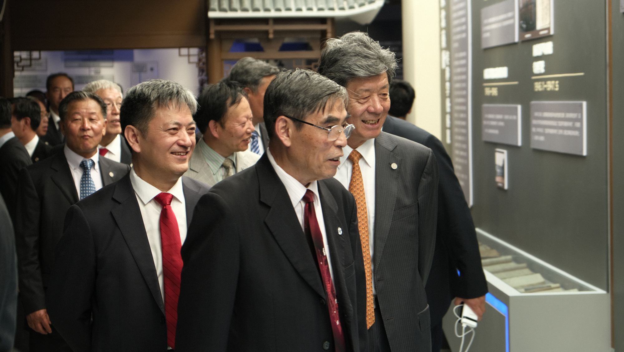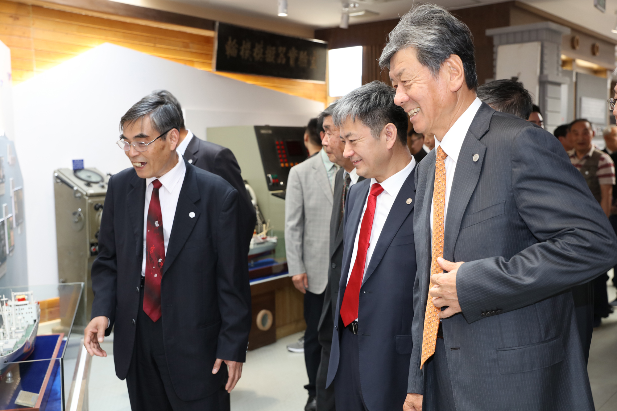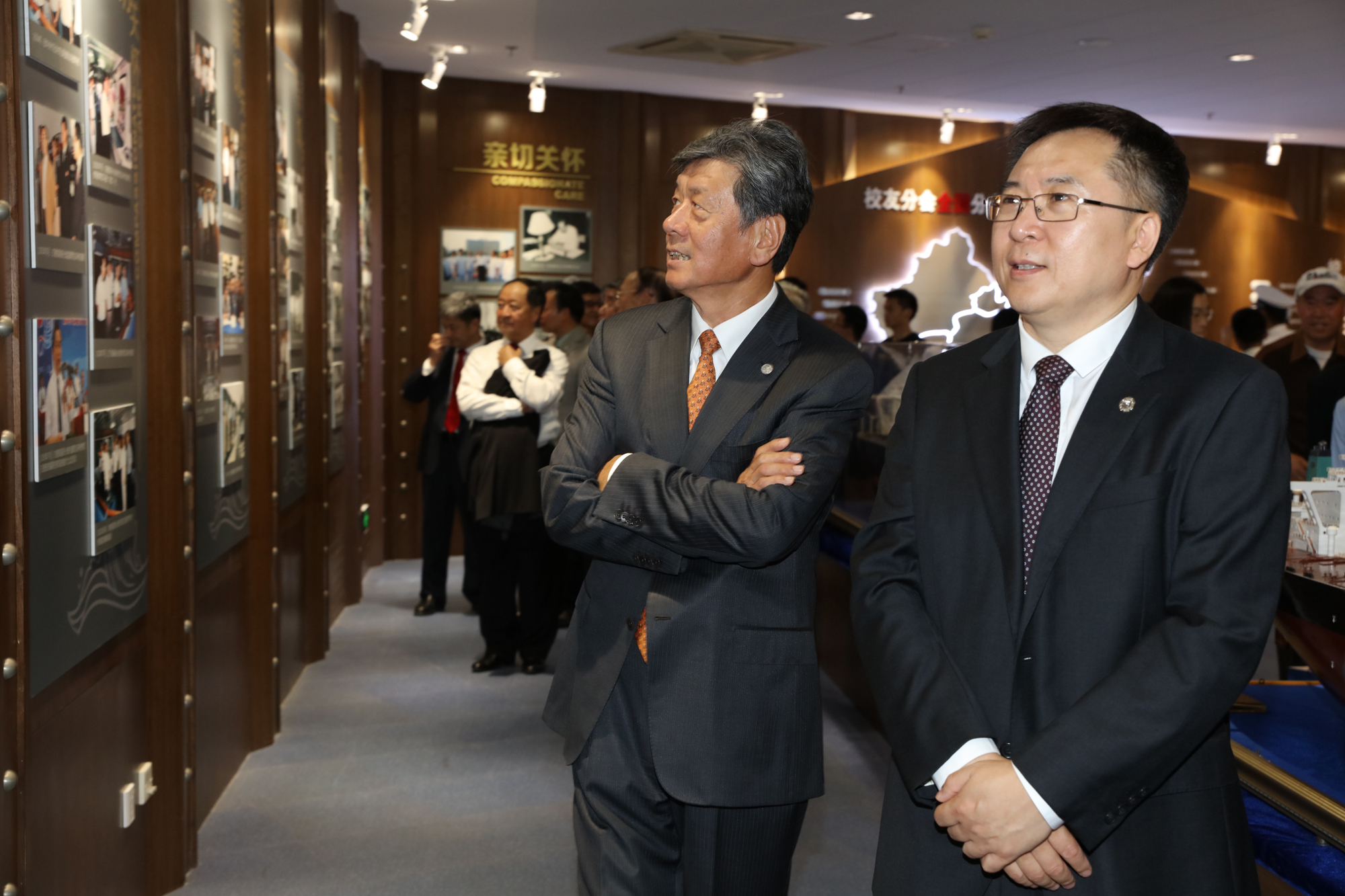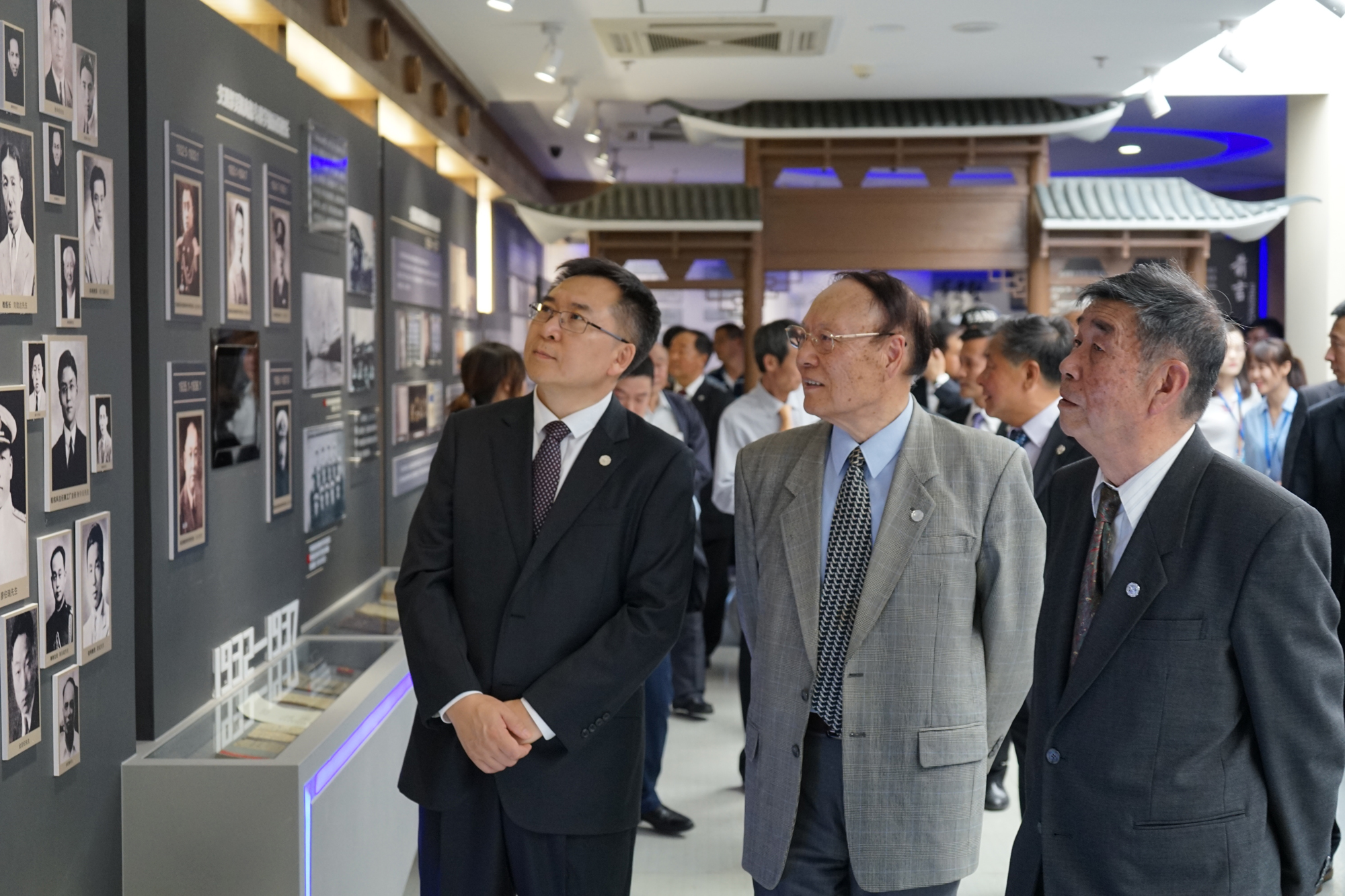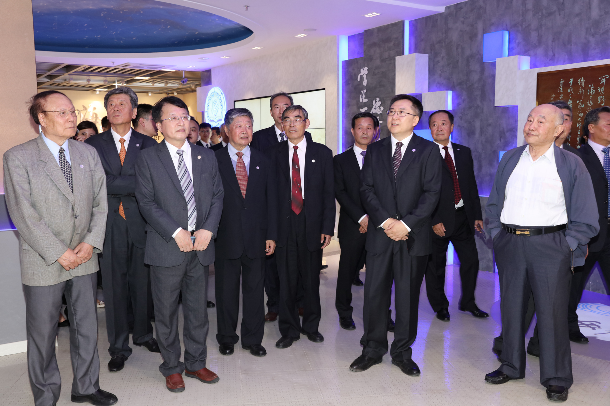 学校老领导司玉琢、郭禹、吴兆麟、王祖温一起为校史展开展揭幕。开展仪式邀请了我校前身上海高等实业学堂首任监督唐文治先生的曾孙唐明德致辞,他带领大家回顾了唐文治先生的治校历史以及唐氏家族为学校发展和我国教育事业所做贡献,并为海大百十诞辰献上诚挚祝福,表达了对海大以及海大人未来发展的美好祝愿。