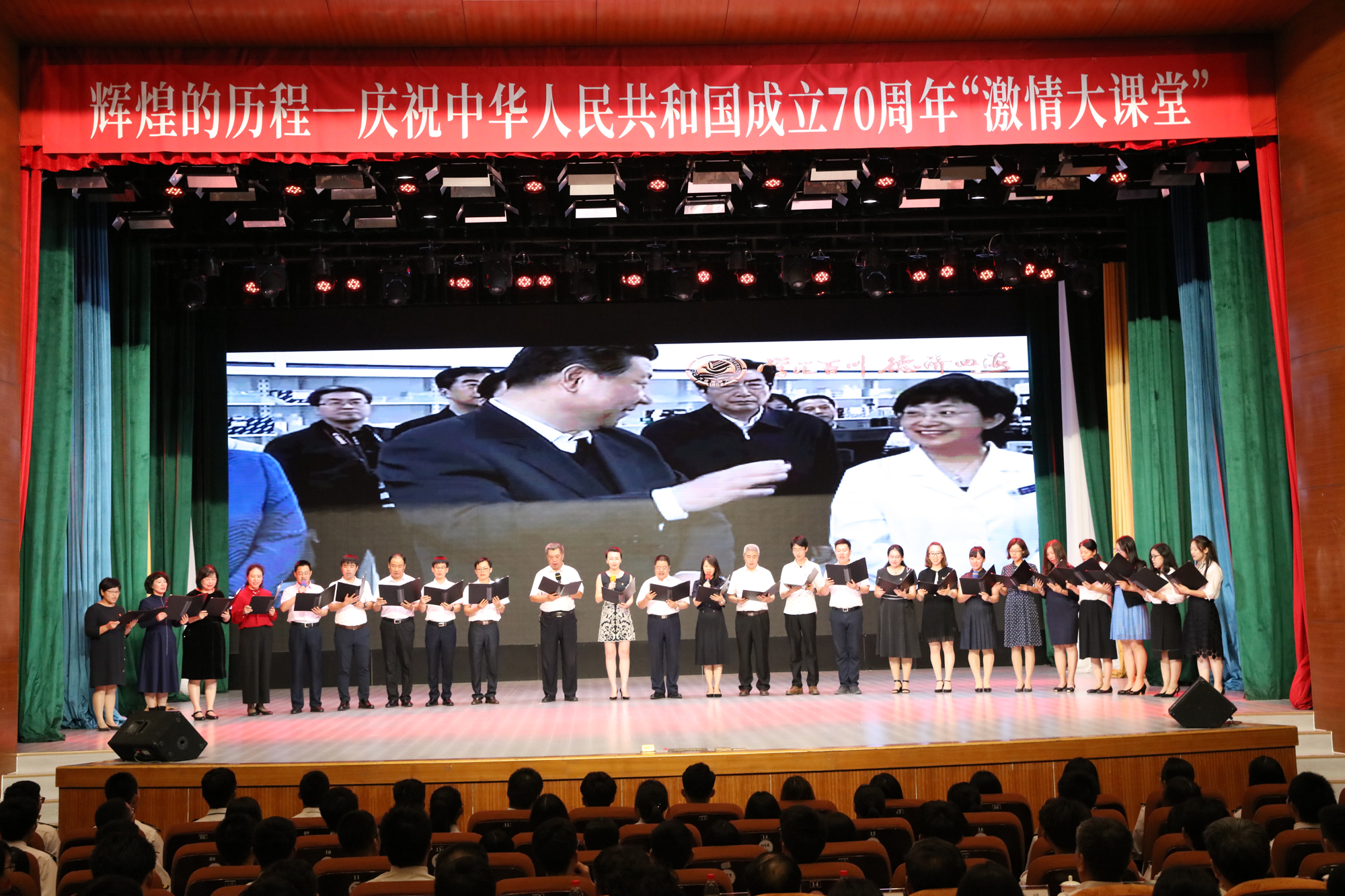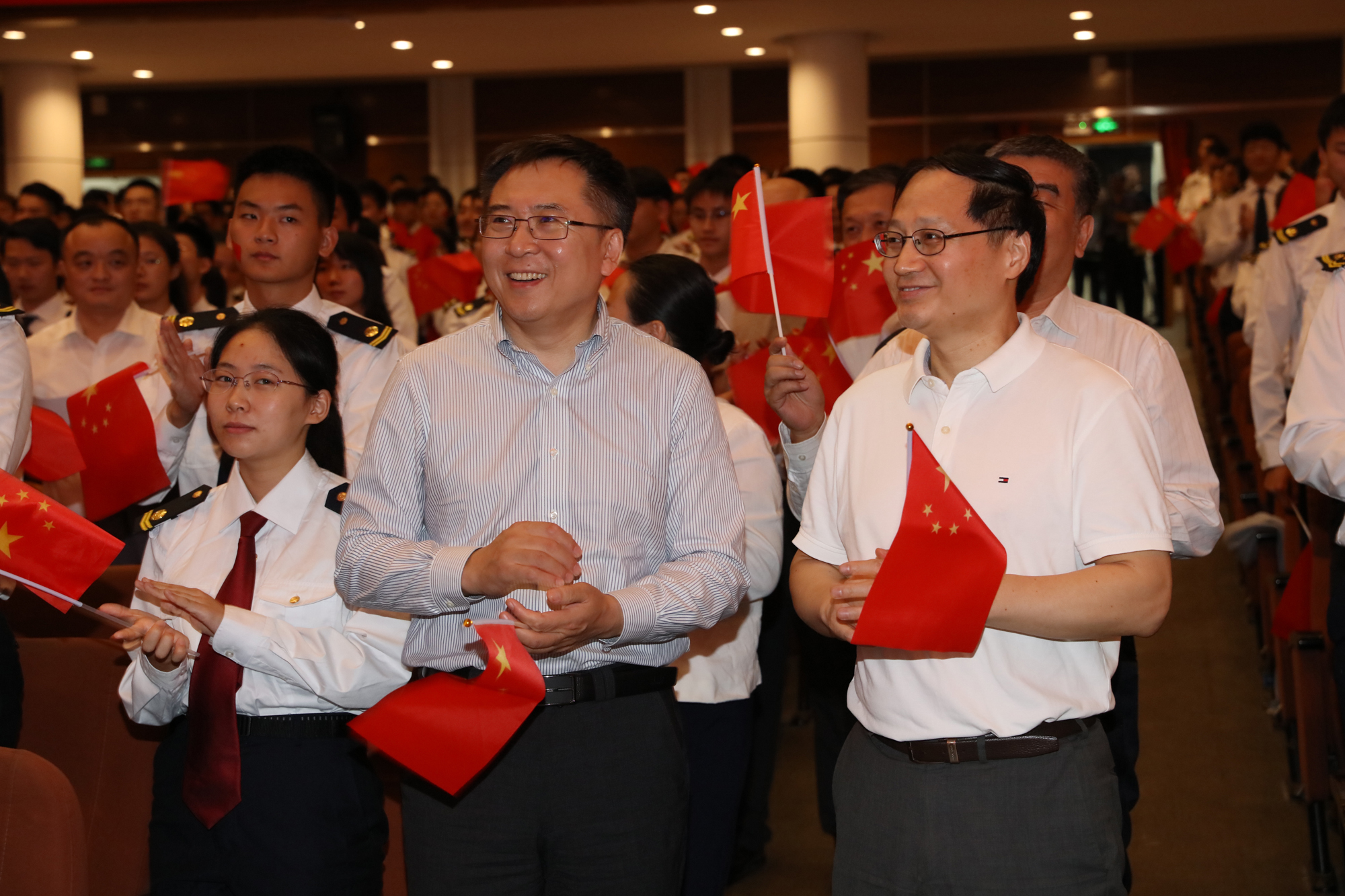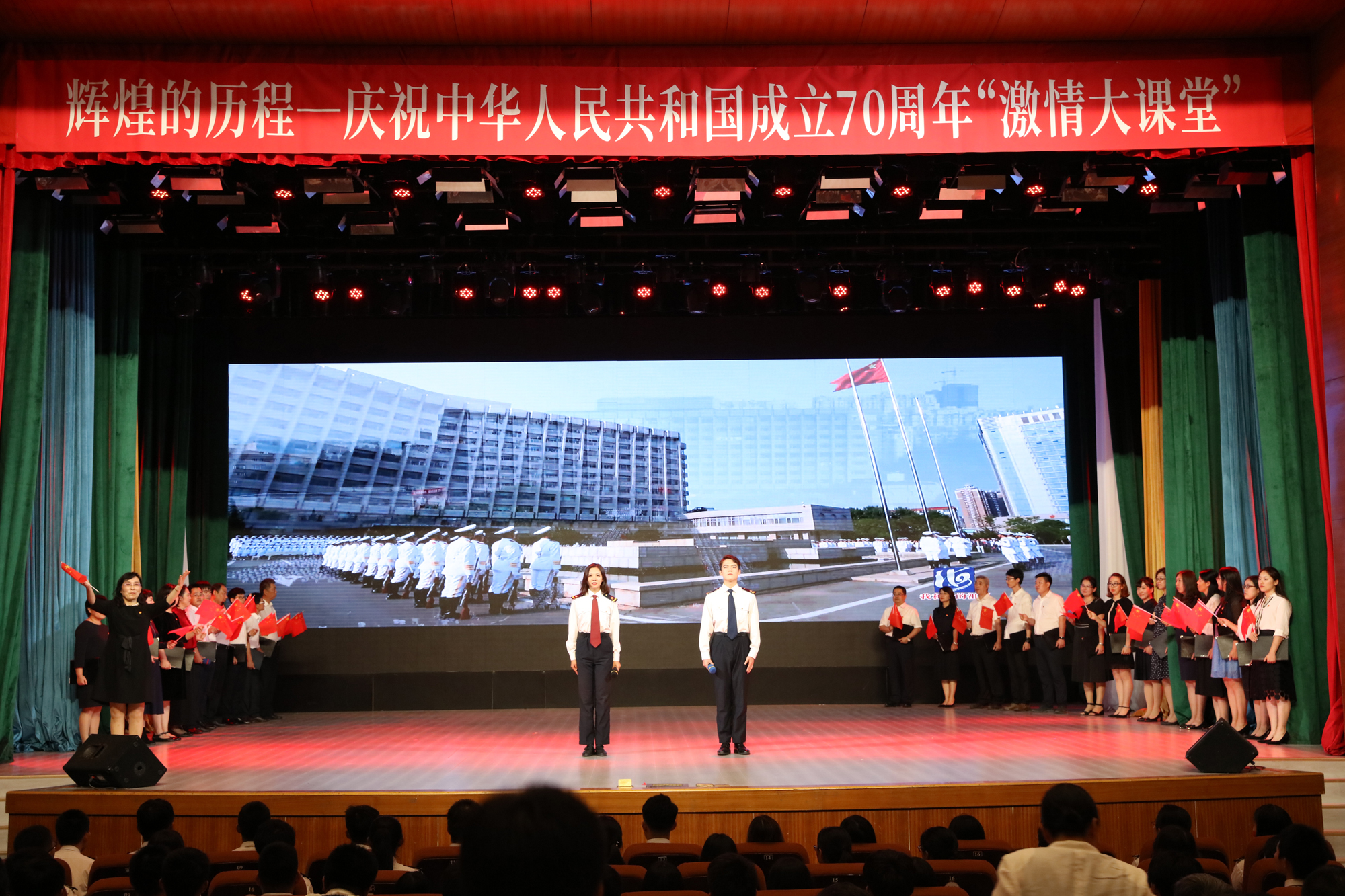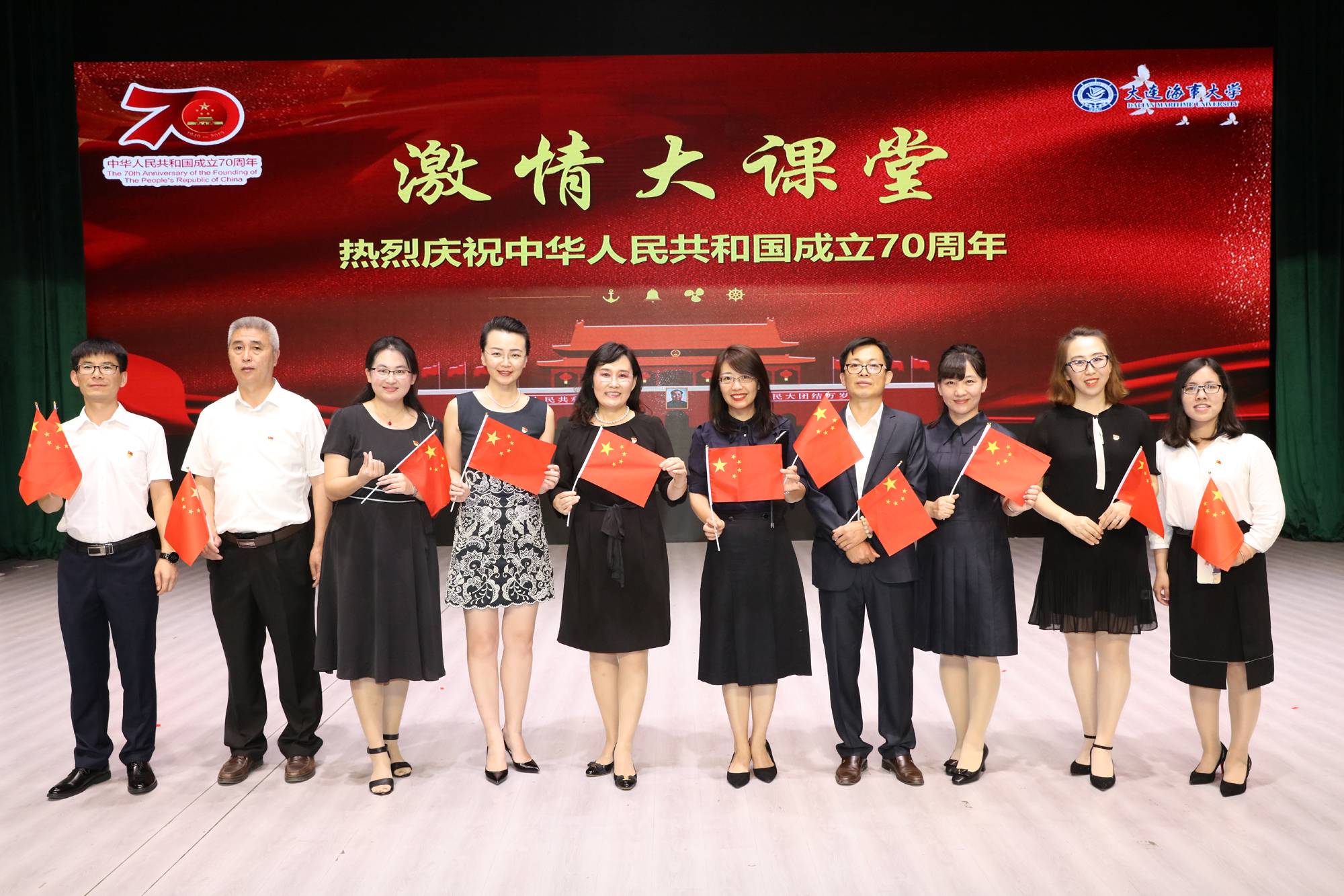 9月26日晚,大连海事大学庆祝中华人民共和国成立70周年而开讲的《毛泽东思想和中国特色社会主义理论体系概论》“激情大课堂”在我校东山礼堂举行。教育部思想政治工作司、交通运输部第二批主题教育指导组的有关领导以及我校校领导和学校相关职能部门负责人、马克思主义学院全体教师和船舶电子电气工程、信息管理与信息系统、英语、船舶与海洋工程、物流管理、数学与应用数学等专业的近千名学生共同参与了这堂别样的思政课。