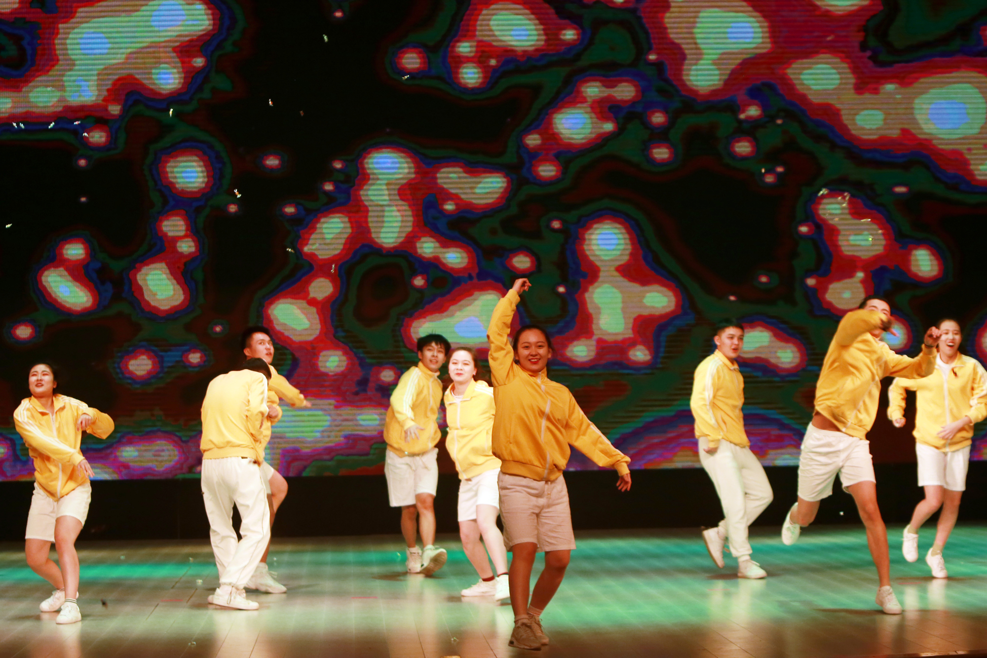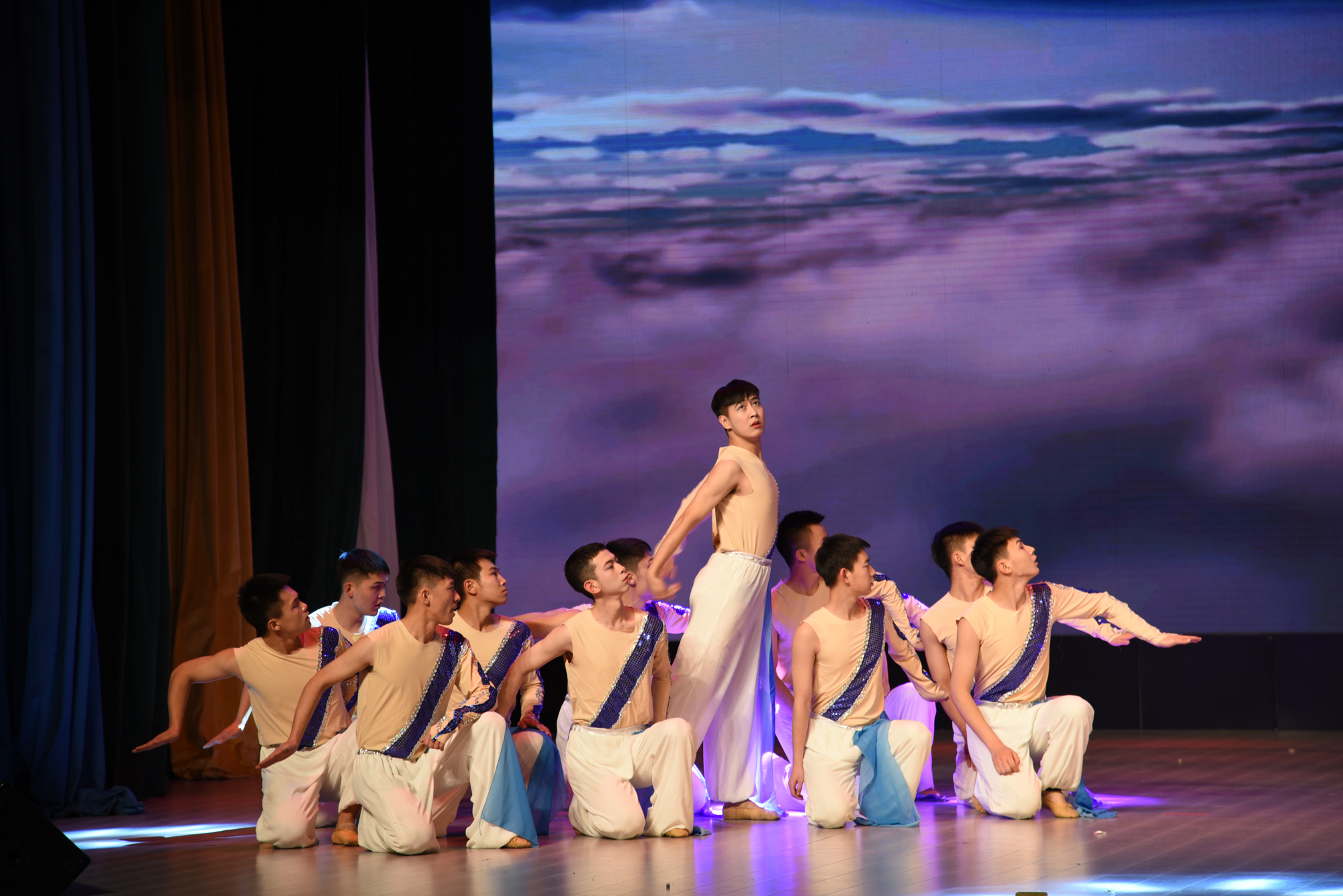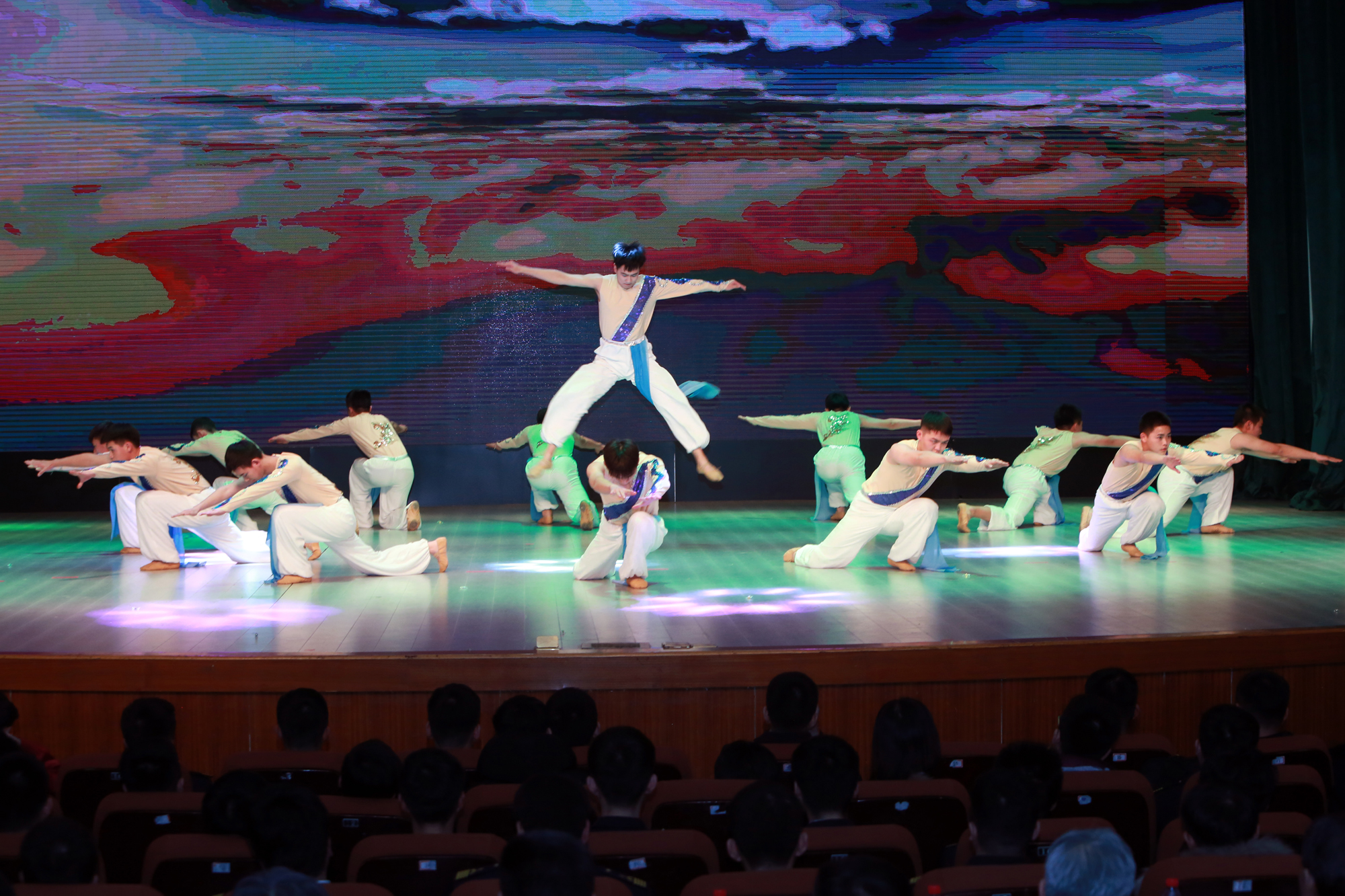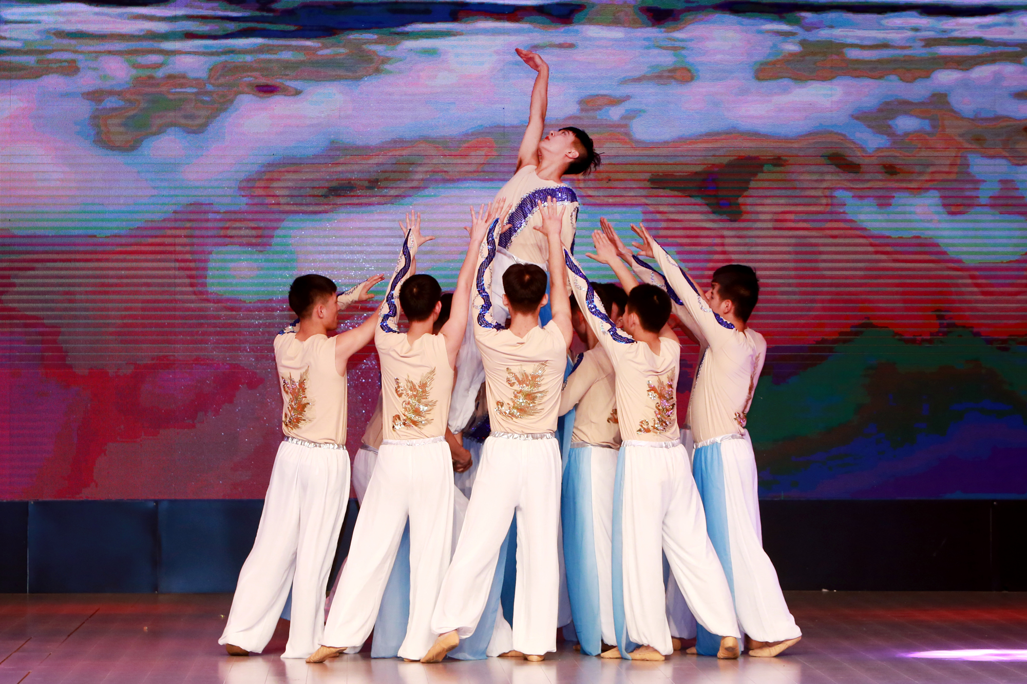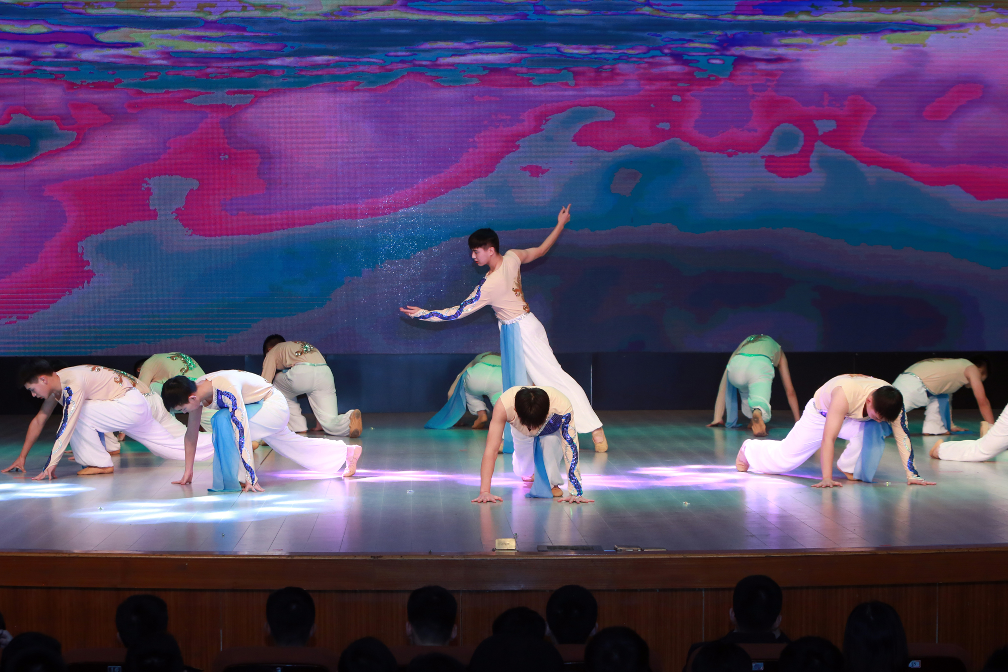 舞蹈《育鲲成鹏》气势磅礴、恢弘大气,展现了航海类专业男儿满怀豪情、披荆斩棘、乘风破浪的气魄。