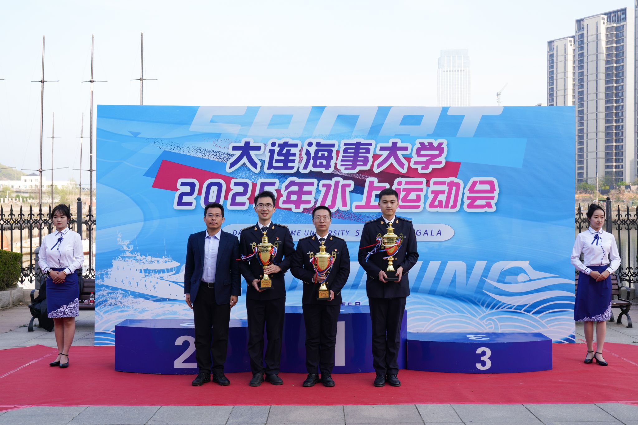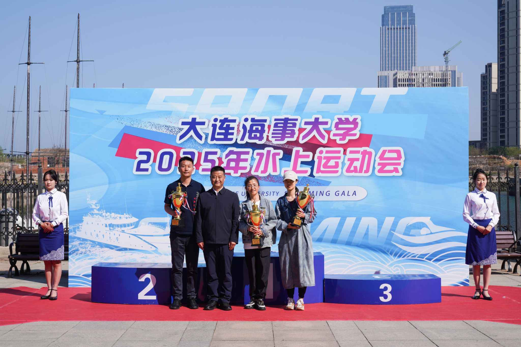 党委学生工作部部长王义波为水上运动会学生组团体前三名代表队颁发奖杯。